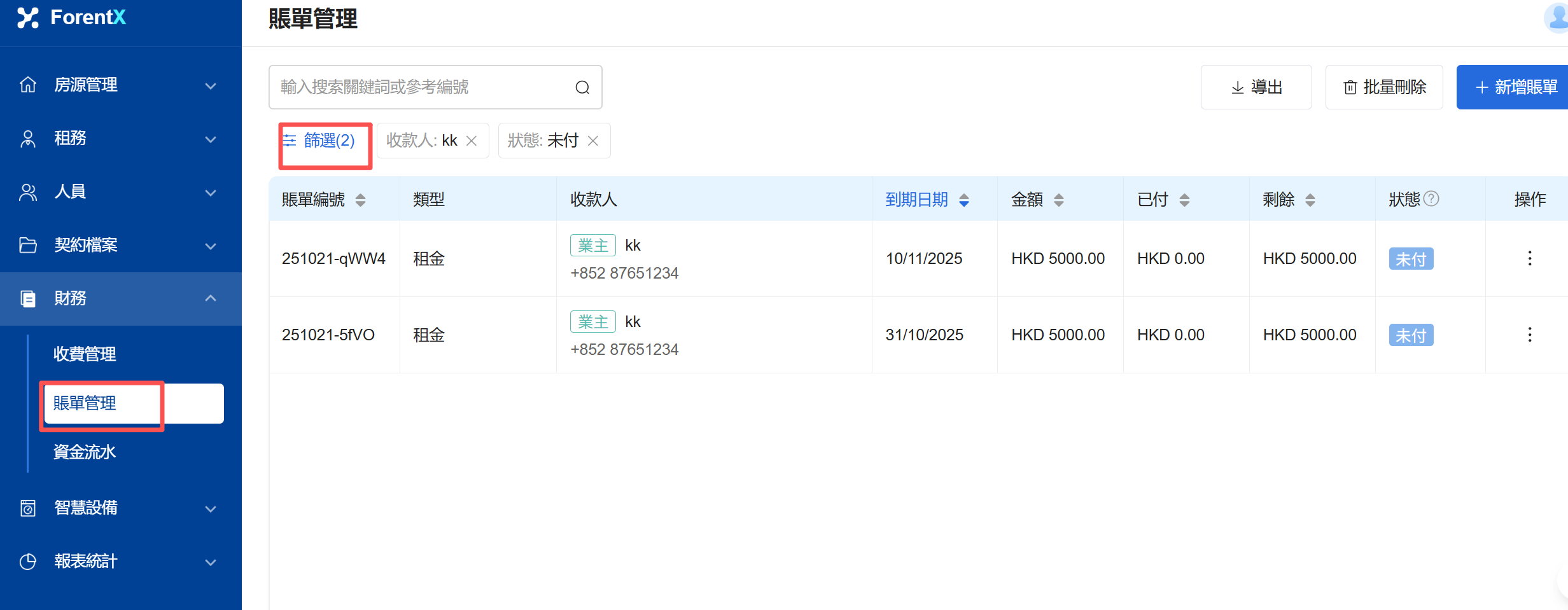 在給業主辦理【退房】後,如果有未結清的賬單,可前往【財務】——【賬單管理】。篩選【未支付】賬單,並對爲結清的賬單進行管理。
