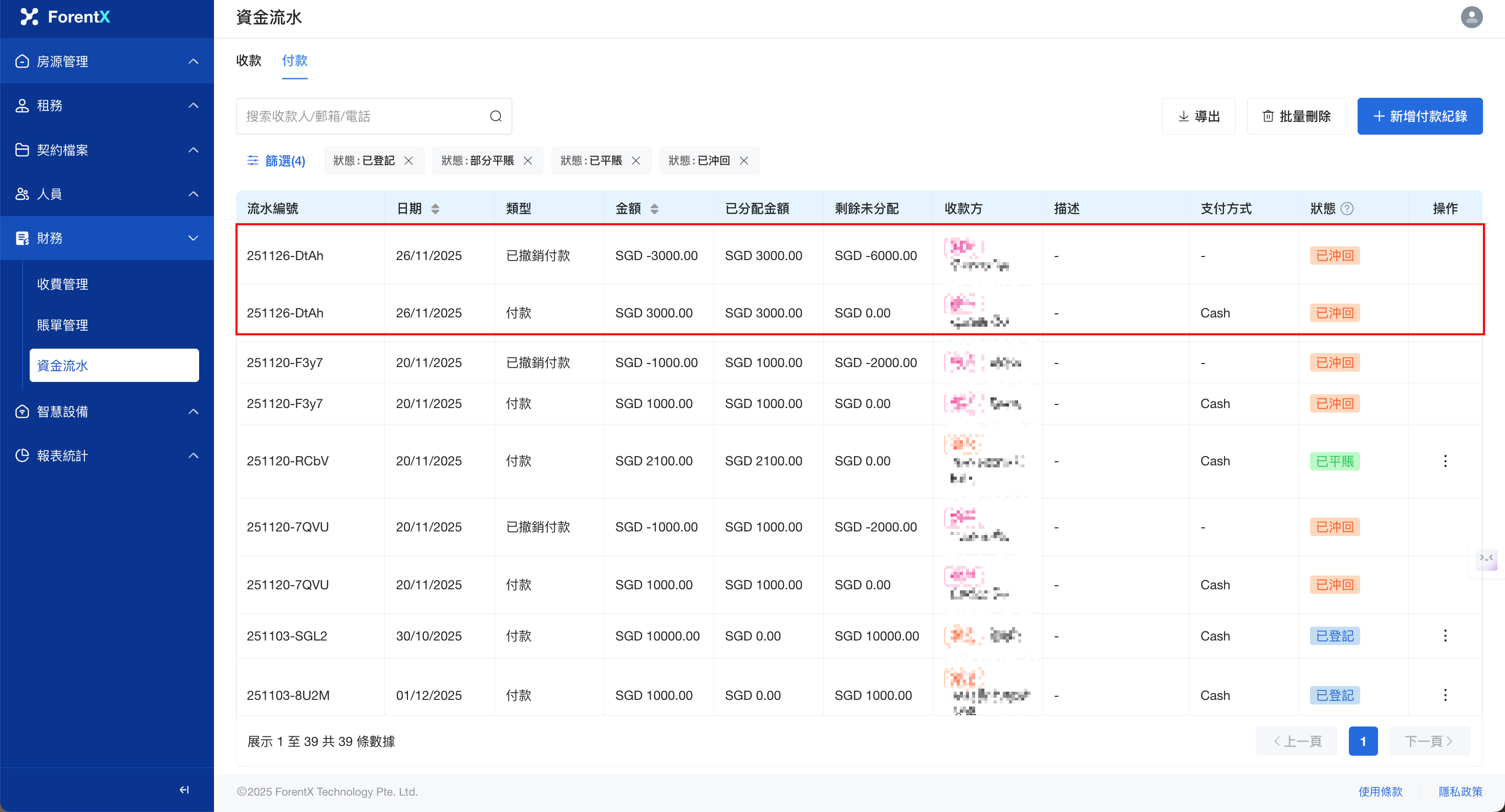 步驟三: 操作完成後,退回的押金將被撤銷。系統將生成一筆對應的負向沖回流水以完成平賬。您可在對應的租賃詳情頁查看到已沖回的數據。