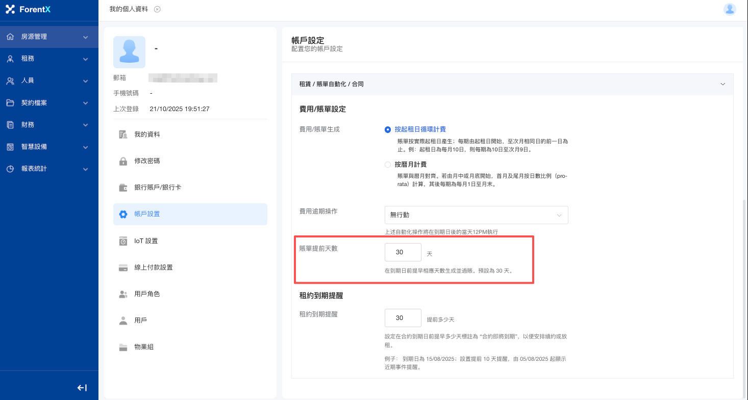 步驟三: 設置完成後,您後續生成的租約 將根據您的配置生成提前提醒。您可以透過 【財務】—【收費管理】 中查看對應的待收款 資訊。