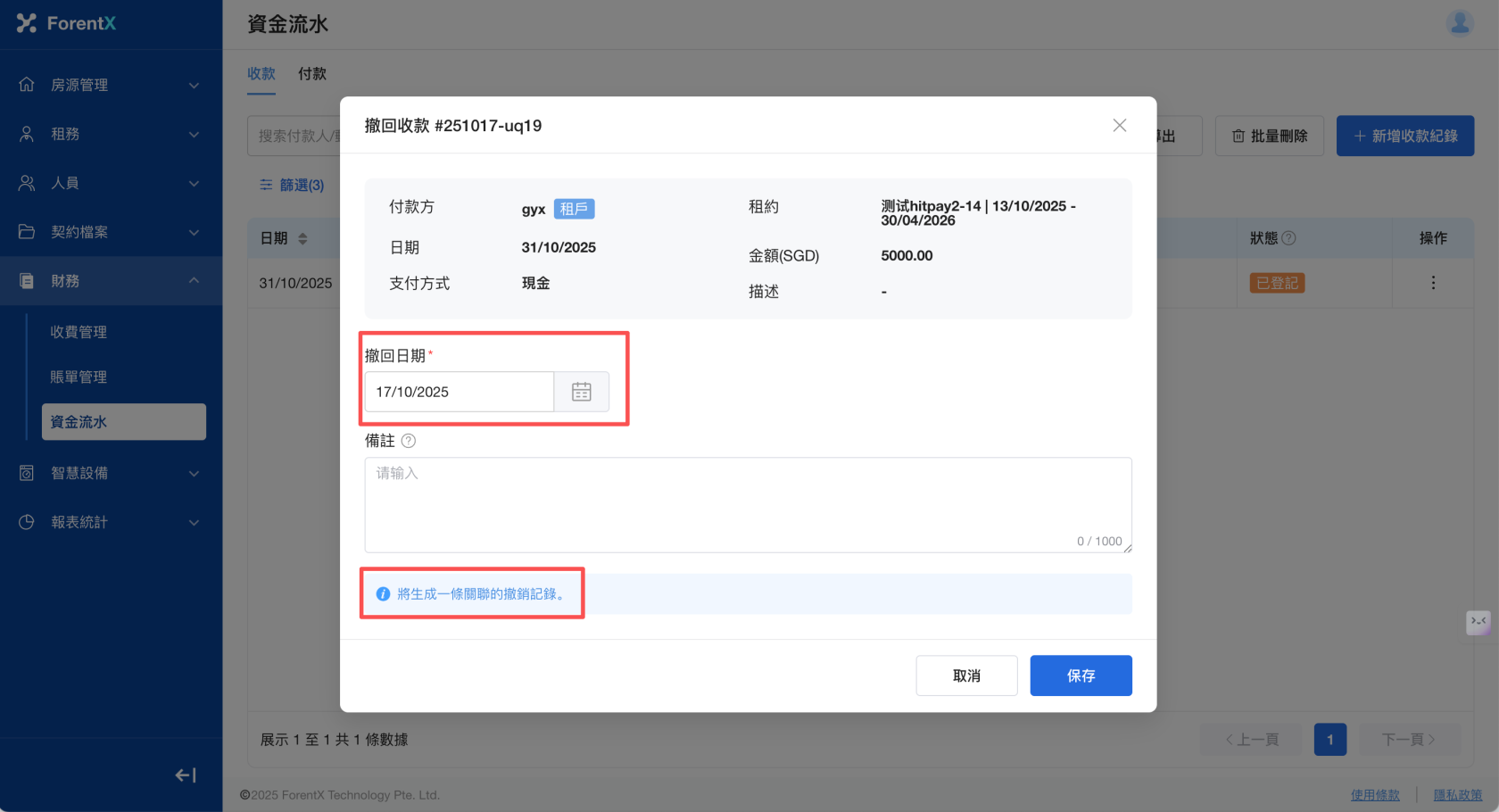 點擊 【取消撤銷】 按鈕,進行二次確認。系統會為您修復該條數據,狀態回歸為 【已登記】。您之前產生的撤銷和沖回數據系統會為您刪除。