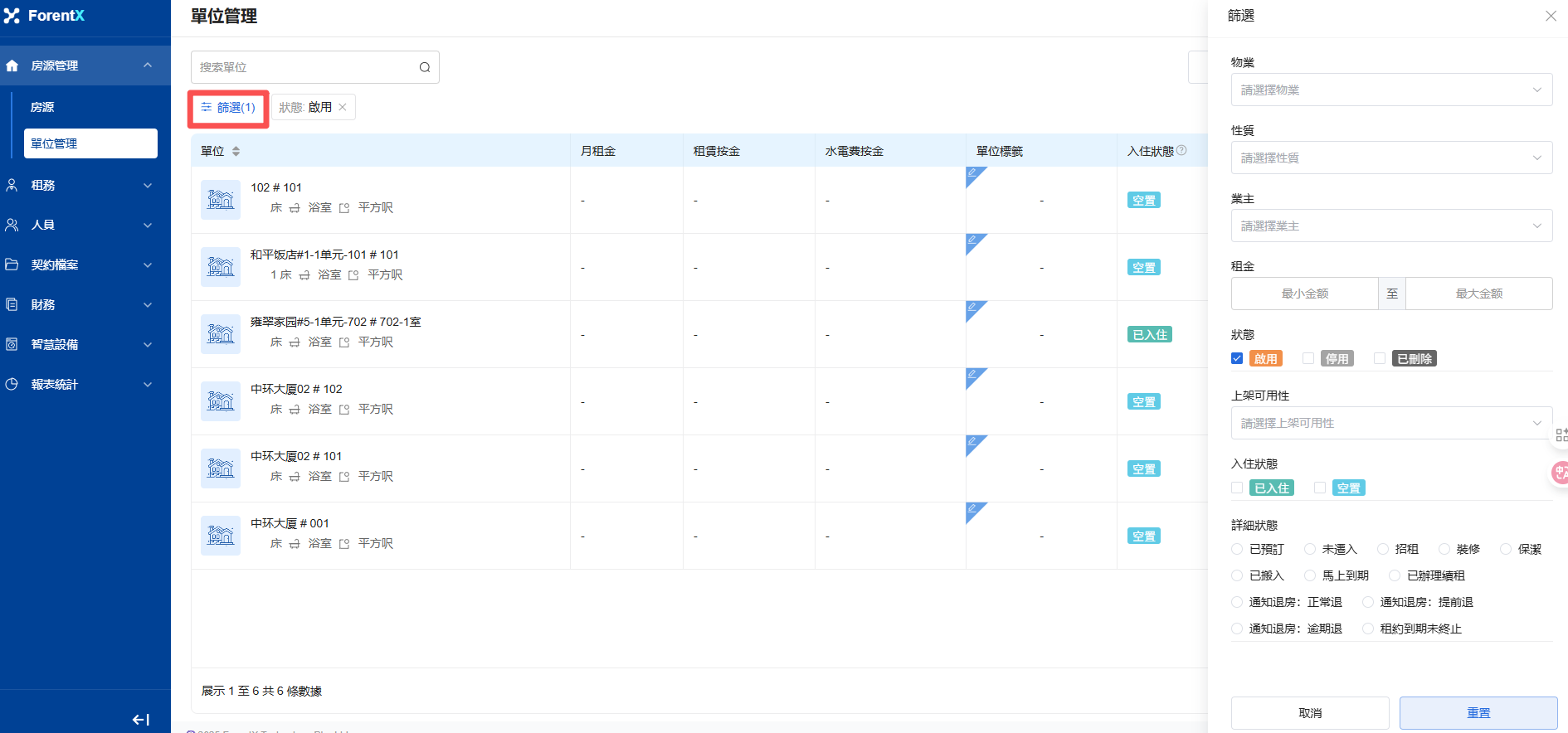 在【房源管理】——【單位管理】您可以通過多條件對您管理的單元進行管理。 可用的篩選條件包括:物業、性質、業務、租金範圍、狀態、商家可用性、入駐狀態、詳細狀態。