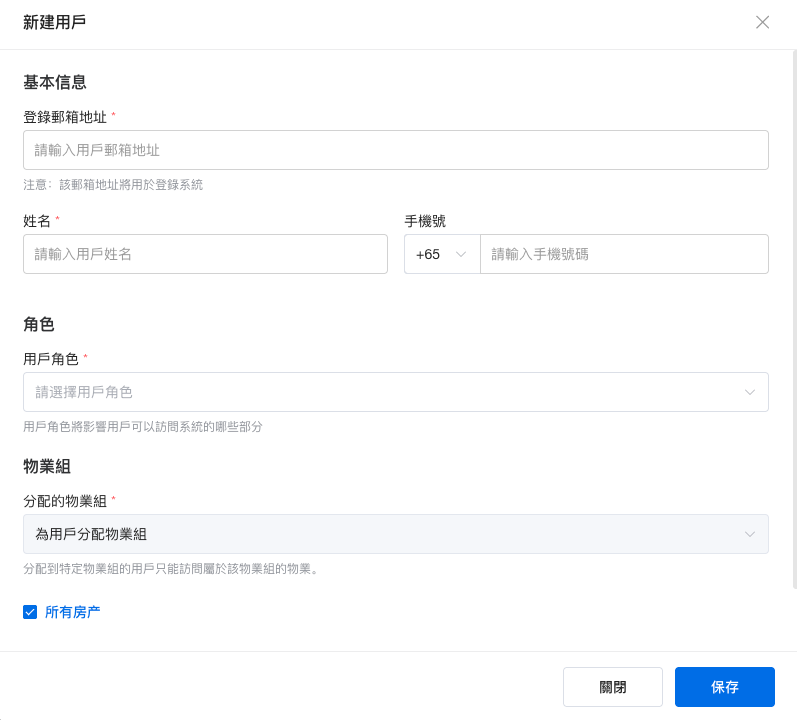 - Assigned Portfolio (分配的物業組): 您可以為用戶指派特定的物業組 (Portfolio)。預設情況下,您可以選擇 All Properties (所有房產) 以授予他們存取您帳戶中所有房產的權限。