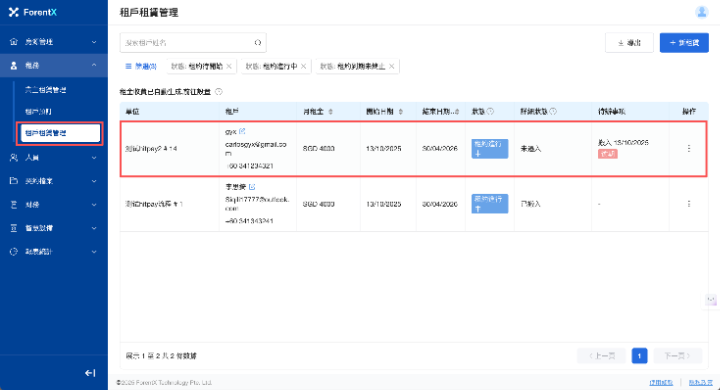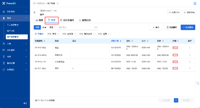 入口二:租賃詳情頁面 從左側菜單導航至 【租務】,選擇 【業主租務管理/租戶預訂/租戶租務管理】,點擊進入 【租賃詳情頁】 後,選擇 【財務】分頁 即可。