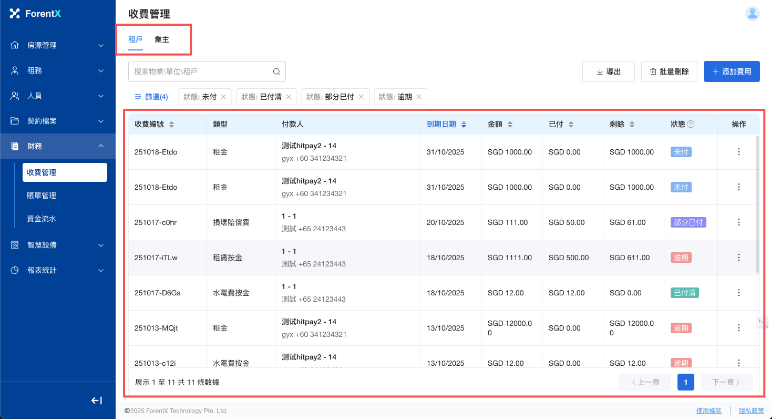入口一:主菜單導航 從 【財務】 — 【收費管理】 進入,然後選擇 【租戶/業主】分頁 進行查看。