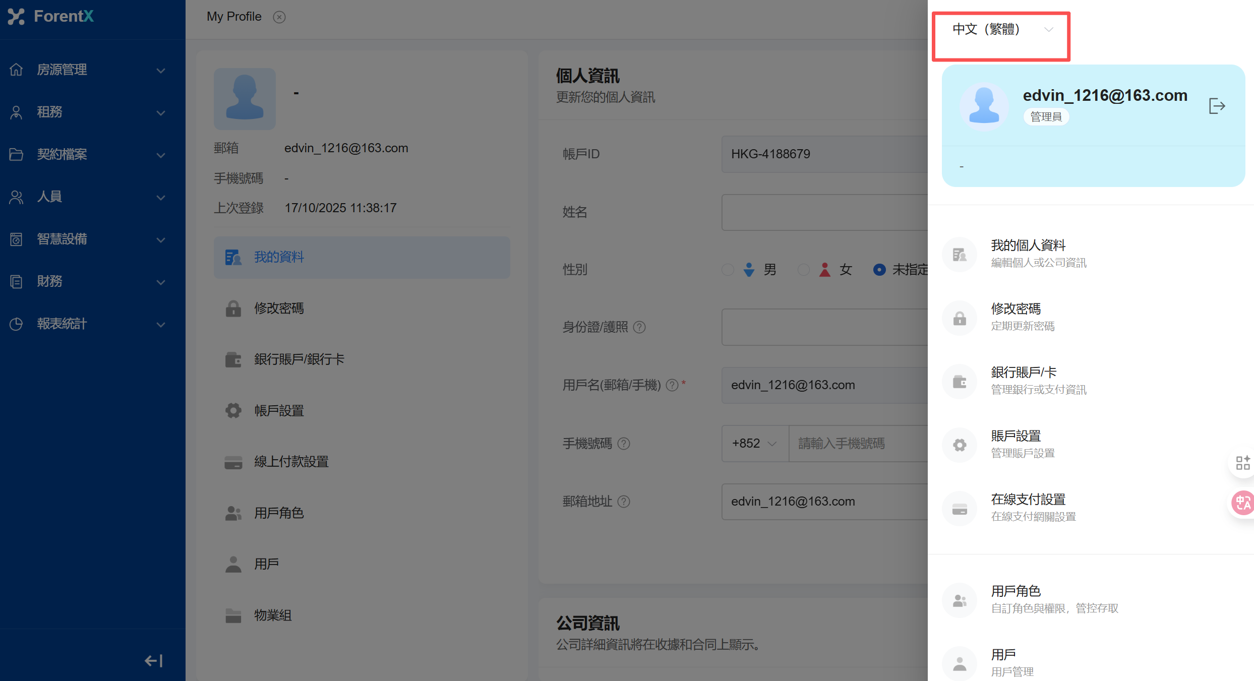 點擊右上角的頭像,在【我的个人資料】中可完善個人姓名、性別、聯繫方式及語言偏好的設置。
