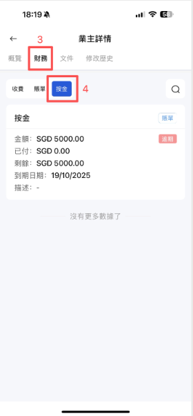 入口: 請選擇 【租務】—【業主租賃管理】,點擊進入 【租賃詳情頁】 後,選擇 【財務】分頁—【按金】分頁。