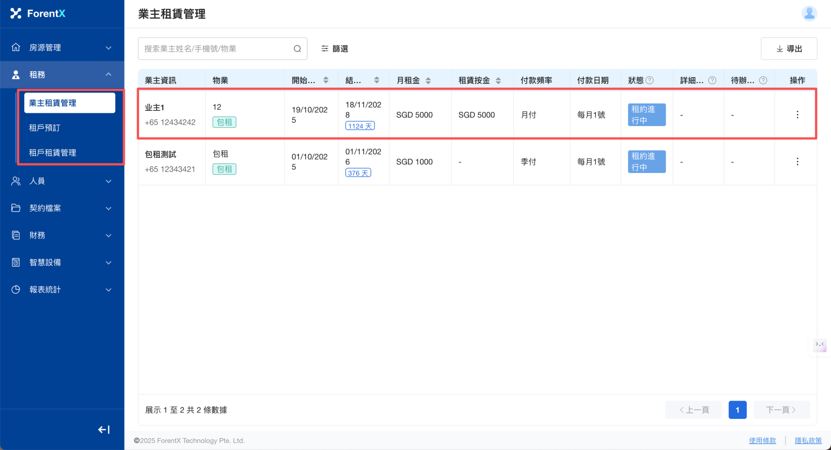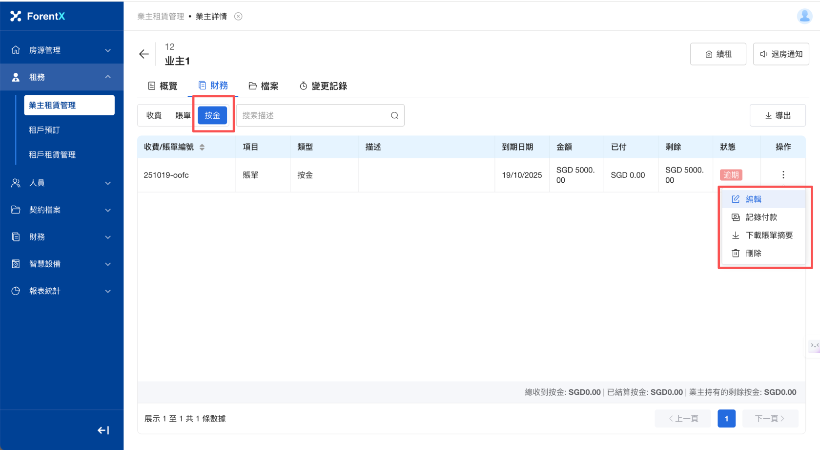 入口: 請從左側菜單導航至 【租務】—【業主租賃管理】,點擊進入 【租賃詳情頁】 後,選擇 【財務】分頁—【押金】分頁。