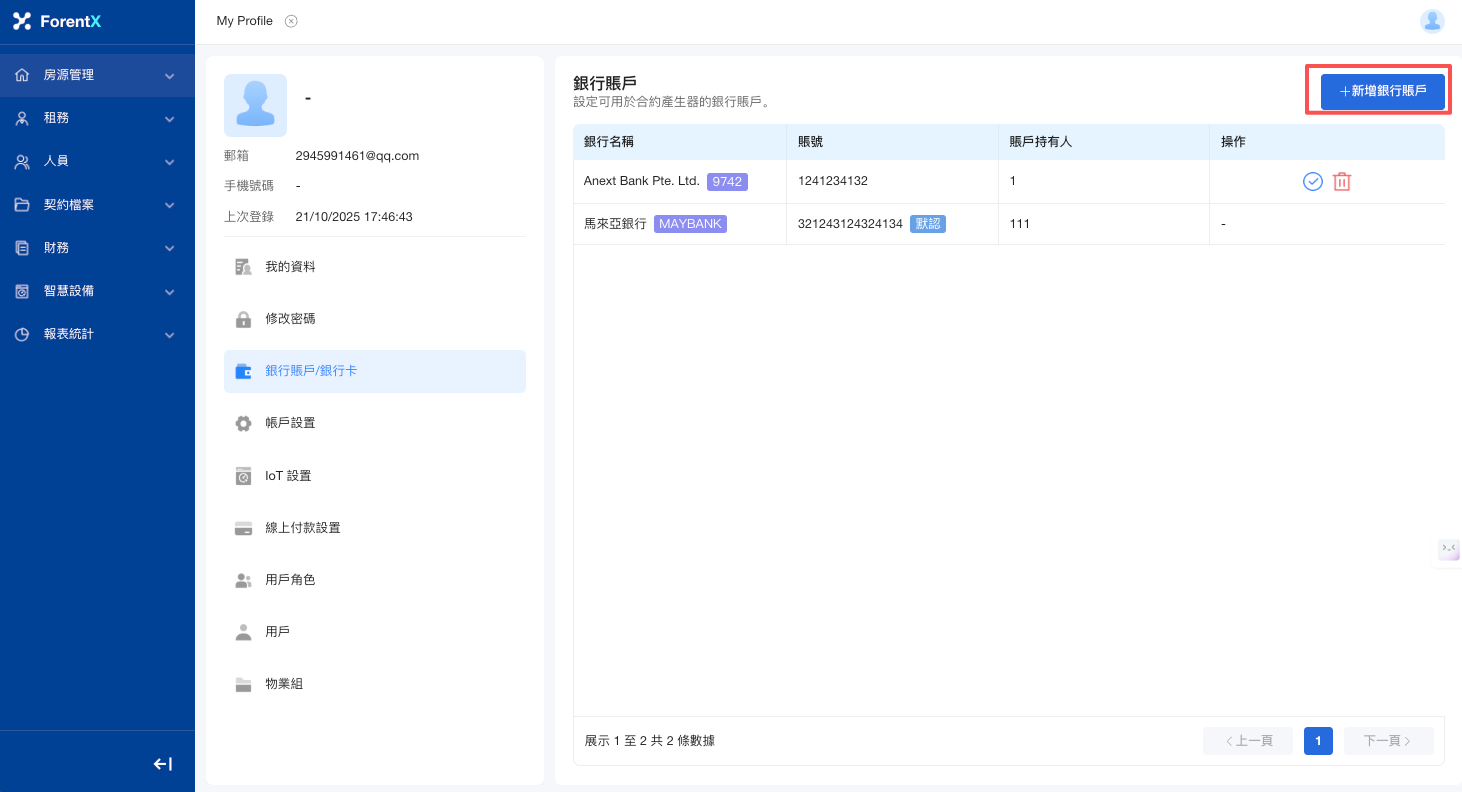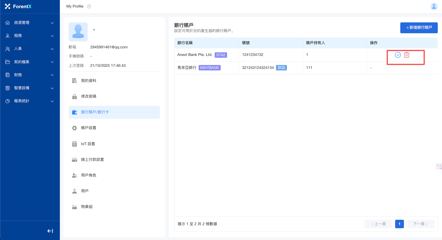 步驟二: 您可設置默認銀行賬戶,後續進行房源管理時系統會為您自動選擇該銀行賬戶;您也可以進行刪除操作。