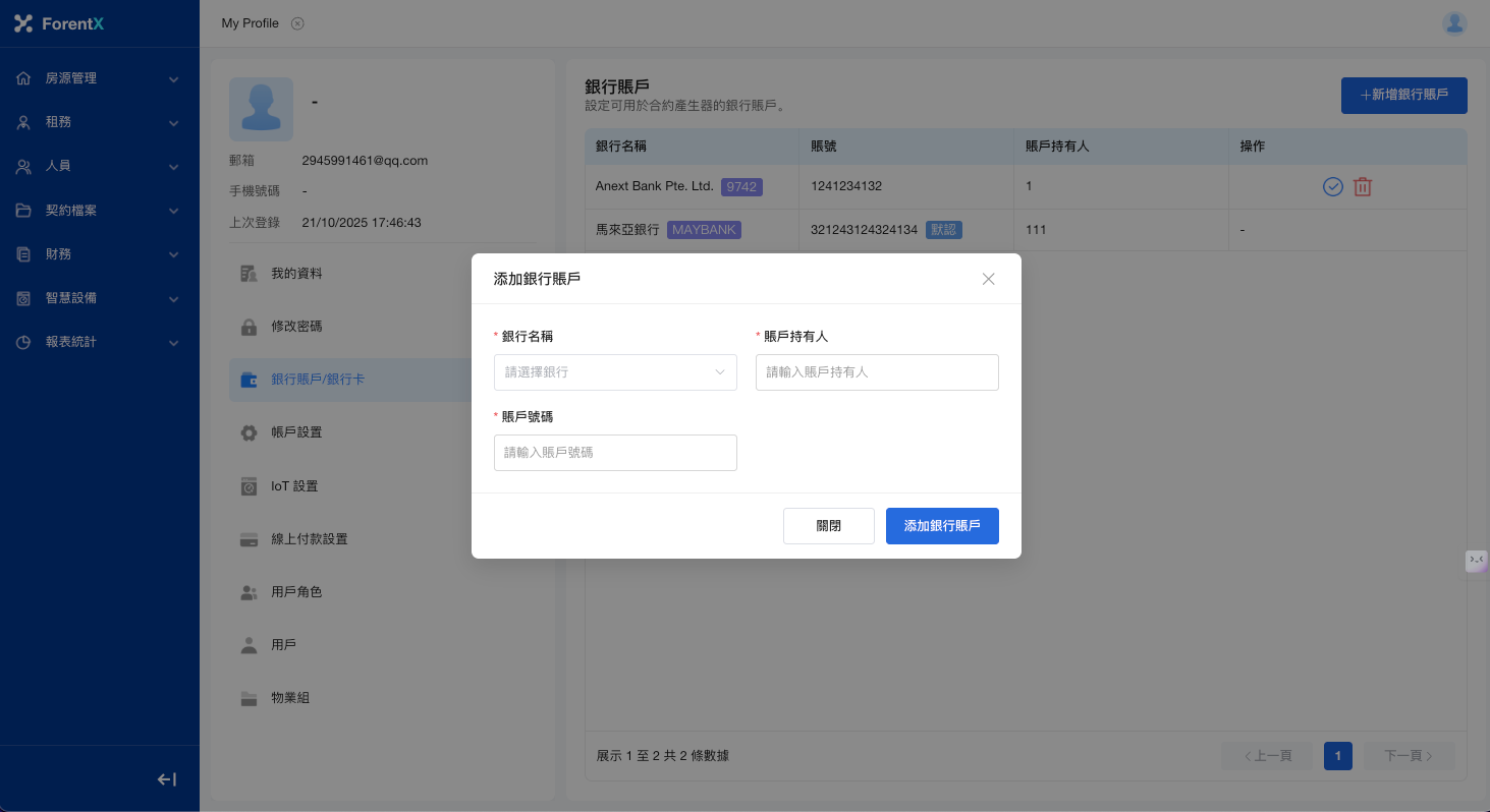 步驟二: 點擊 【新增銀行賬戶】,填寫 銀行名稱、賬戶持有人、賬戶號碼,點擊 【保存】,系統將為您生成銀行賬戶資訊。