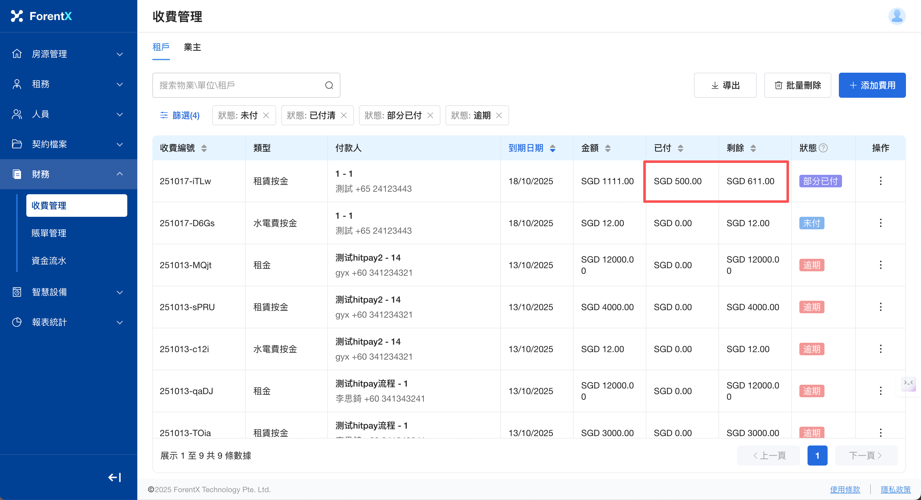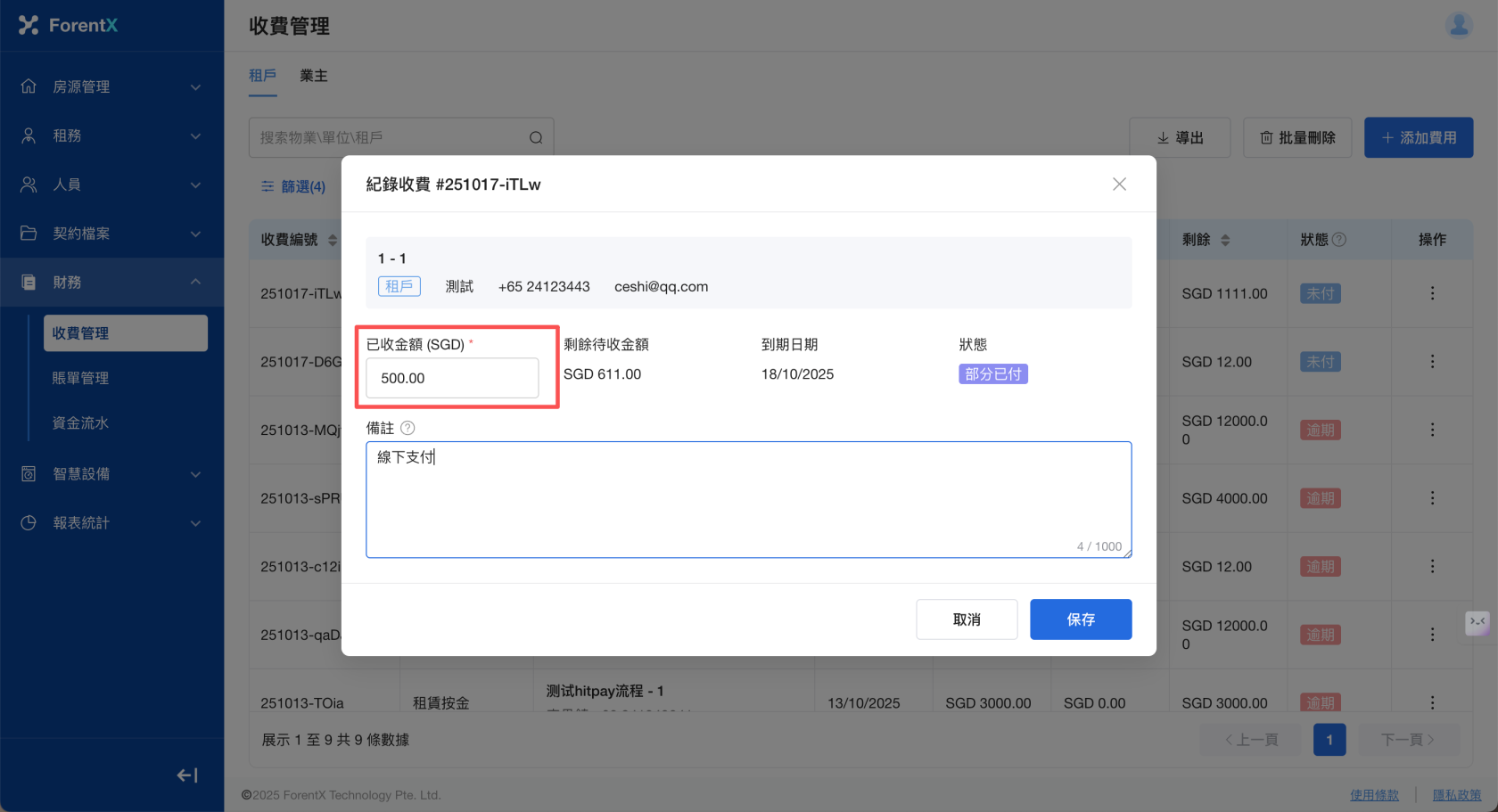 步驟三: 填寫 【已收金額】,點擊 【保存】。系統會為您更新該筆賬單的金額以及狀態。