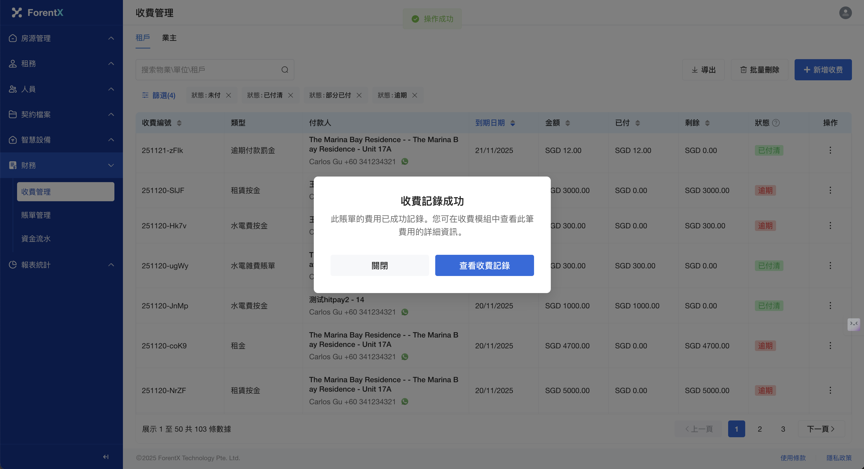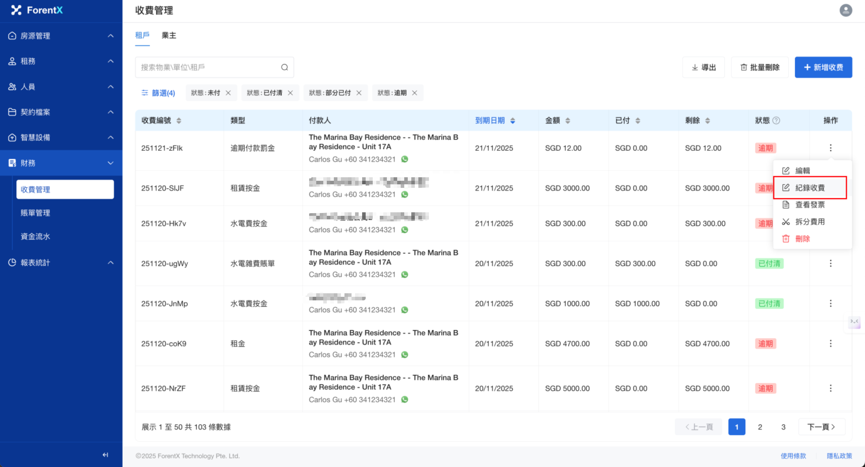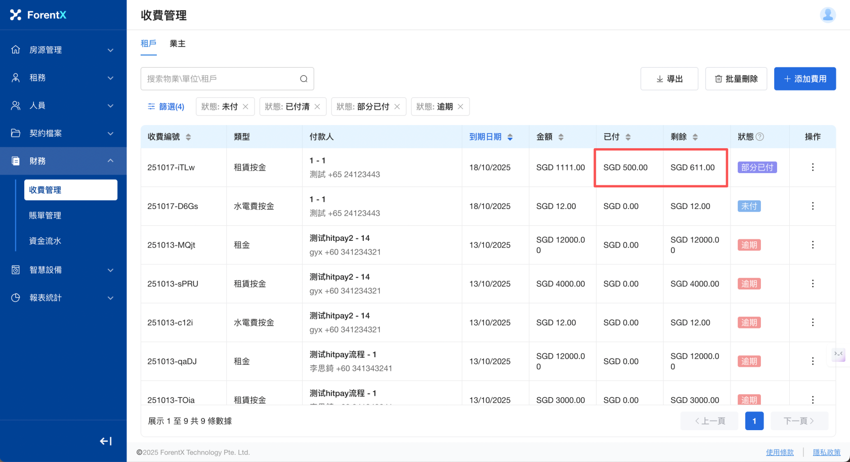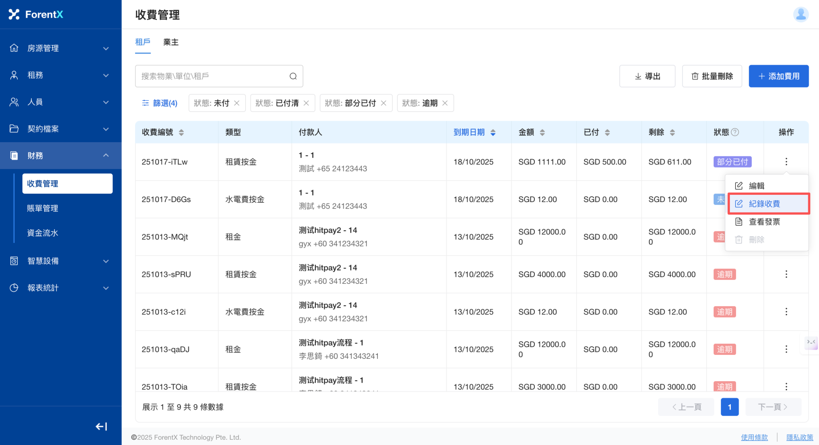 步驟一: 請從左側菜單導航至 【財務】—【收費管理】,然後選擇 【租戶】分頁。