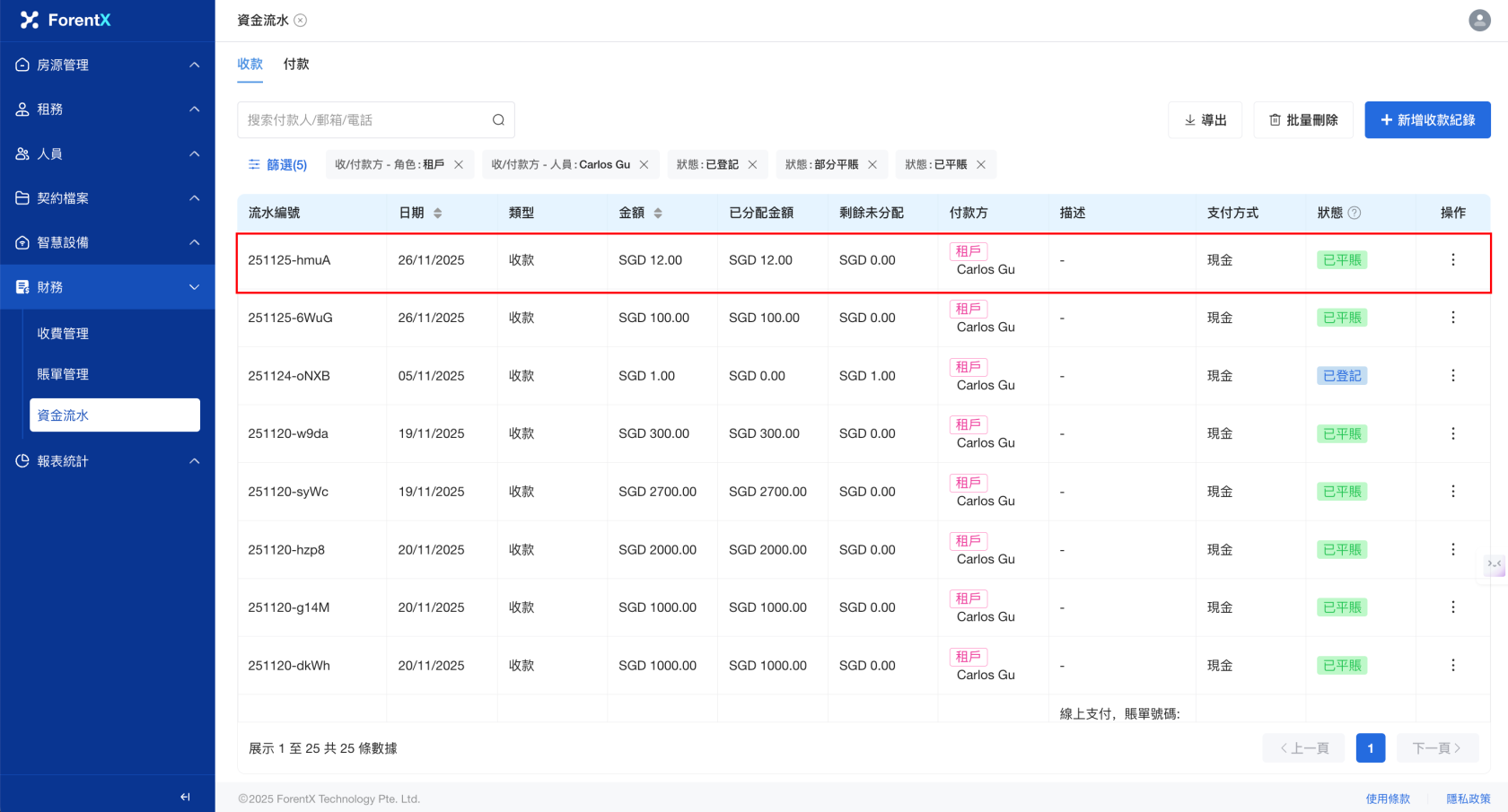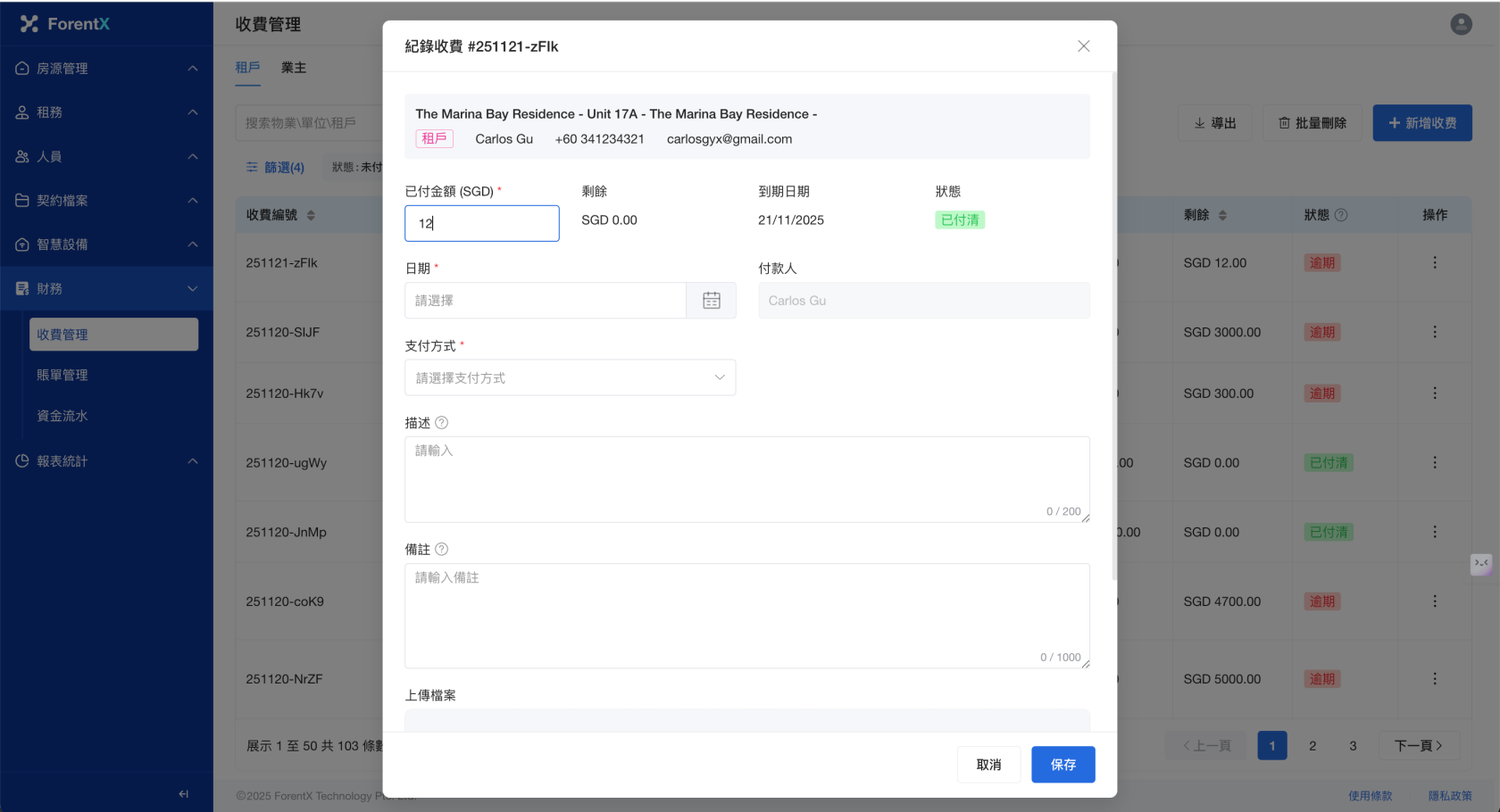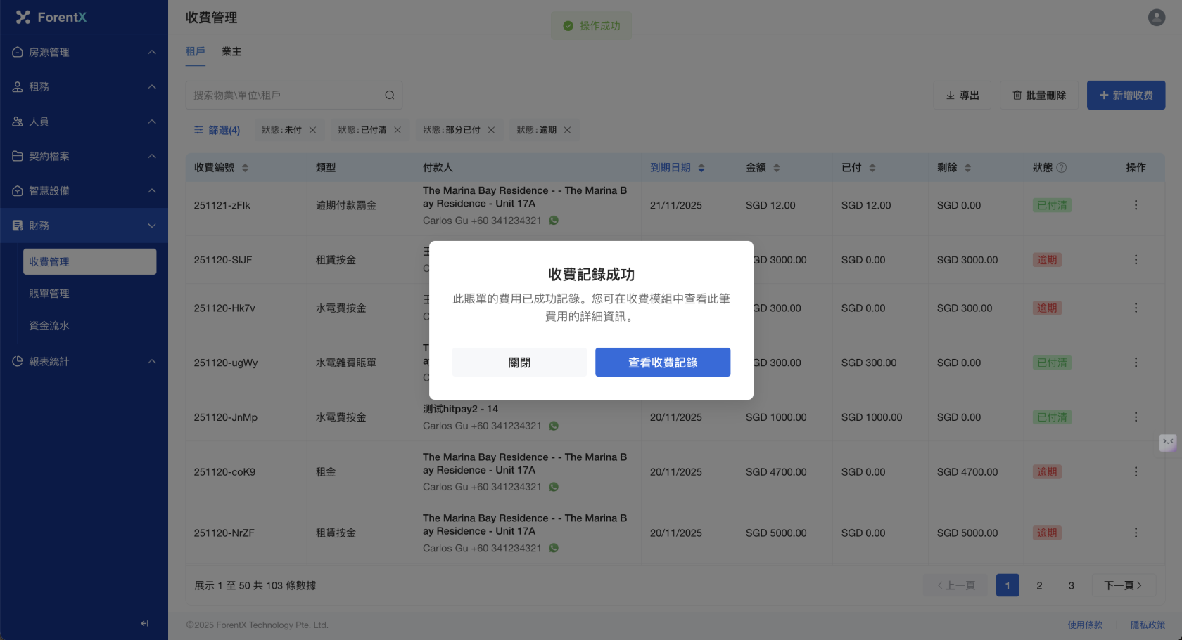 步驟三: 請填寫 【已收金額】,點擊 【保存】 , 【收費管理】 列表將為您更新數據。您也可以選擇跳轉到 【資金流水】 頁面,查看您生成的收費記錄。