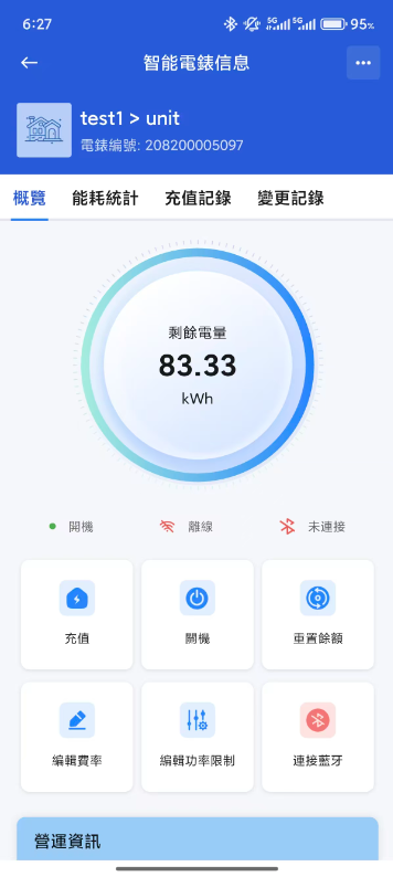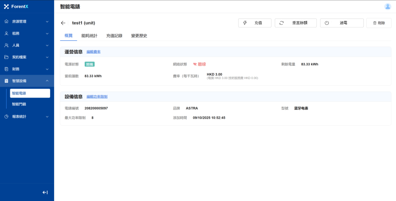 點擊[設備],選擇[智慧電錶],進入電錶詳情頁,點擊[開機]/[關機]進行通電/斷電操作;
