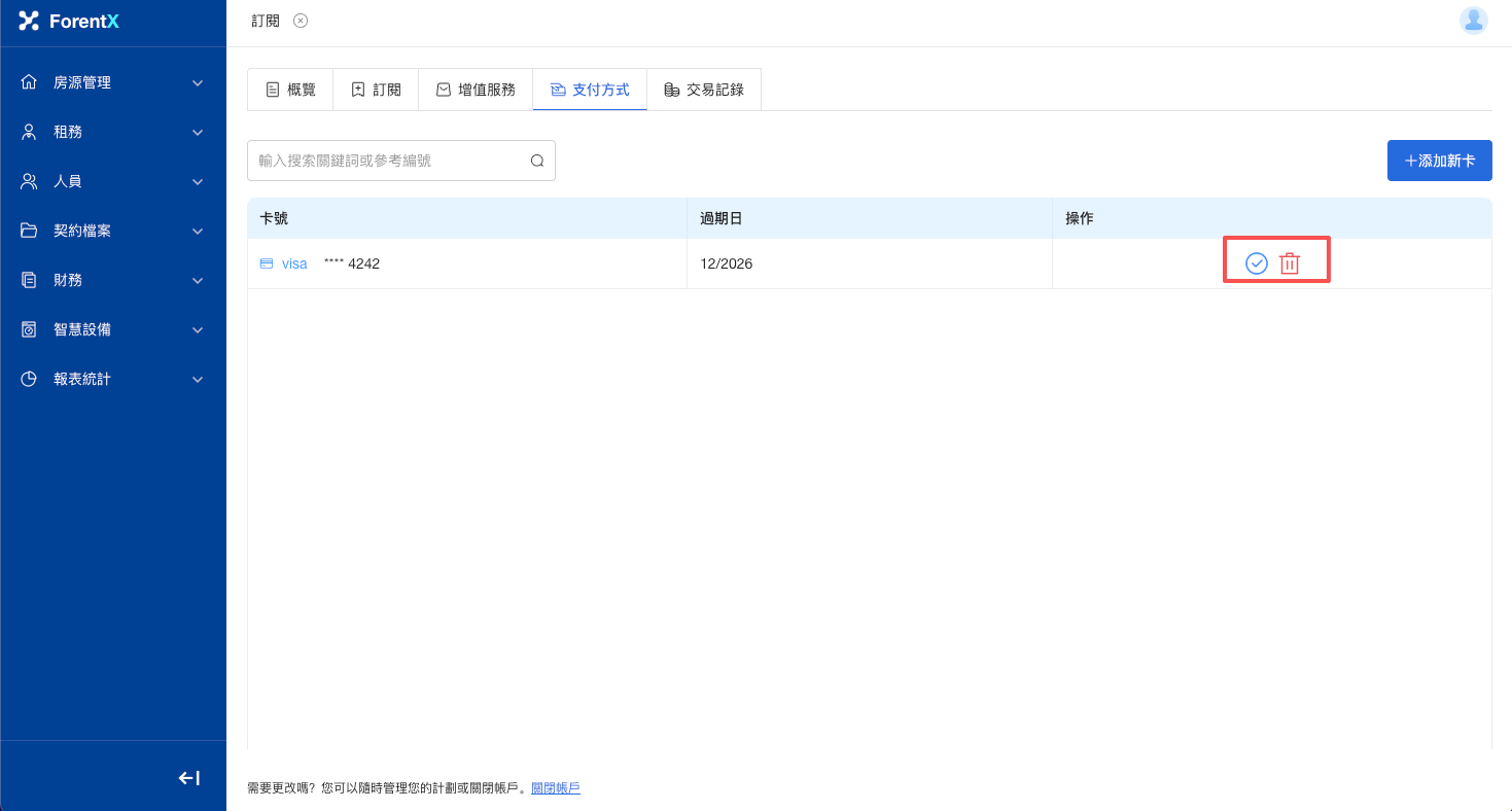 步驟二: 您可設置默認銀行賬戶,後續進行訂閱付費時系統會為您自動選擇該銀行賬戶;您也可以進行刪除操作。