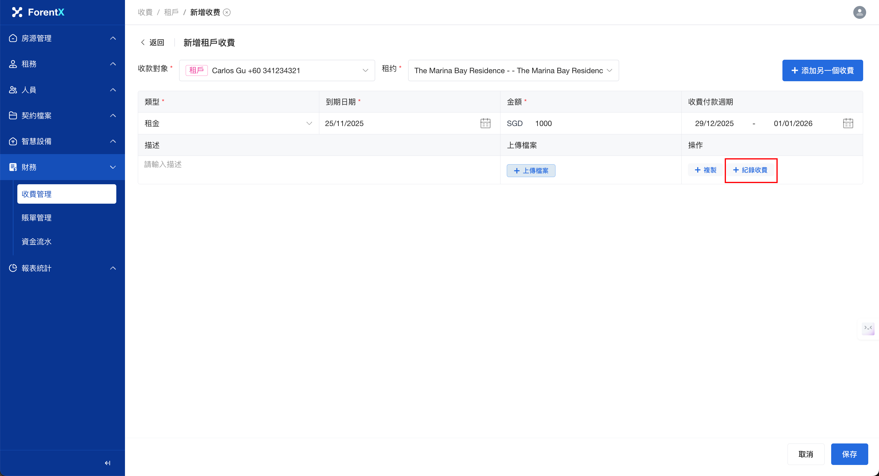 步驟二: 選擇收款對象、租約、類型、到期日期、金額 等資訊。 您可在新建帳單時紀錄收費,會生成一筆對應的流水。