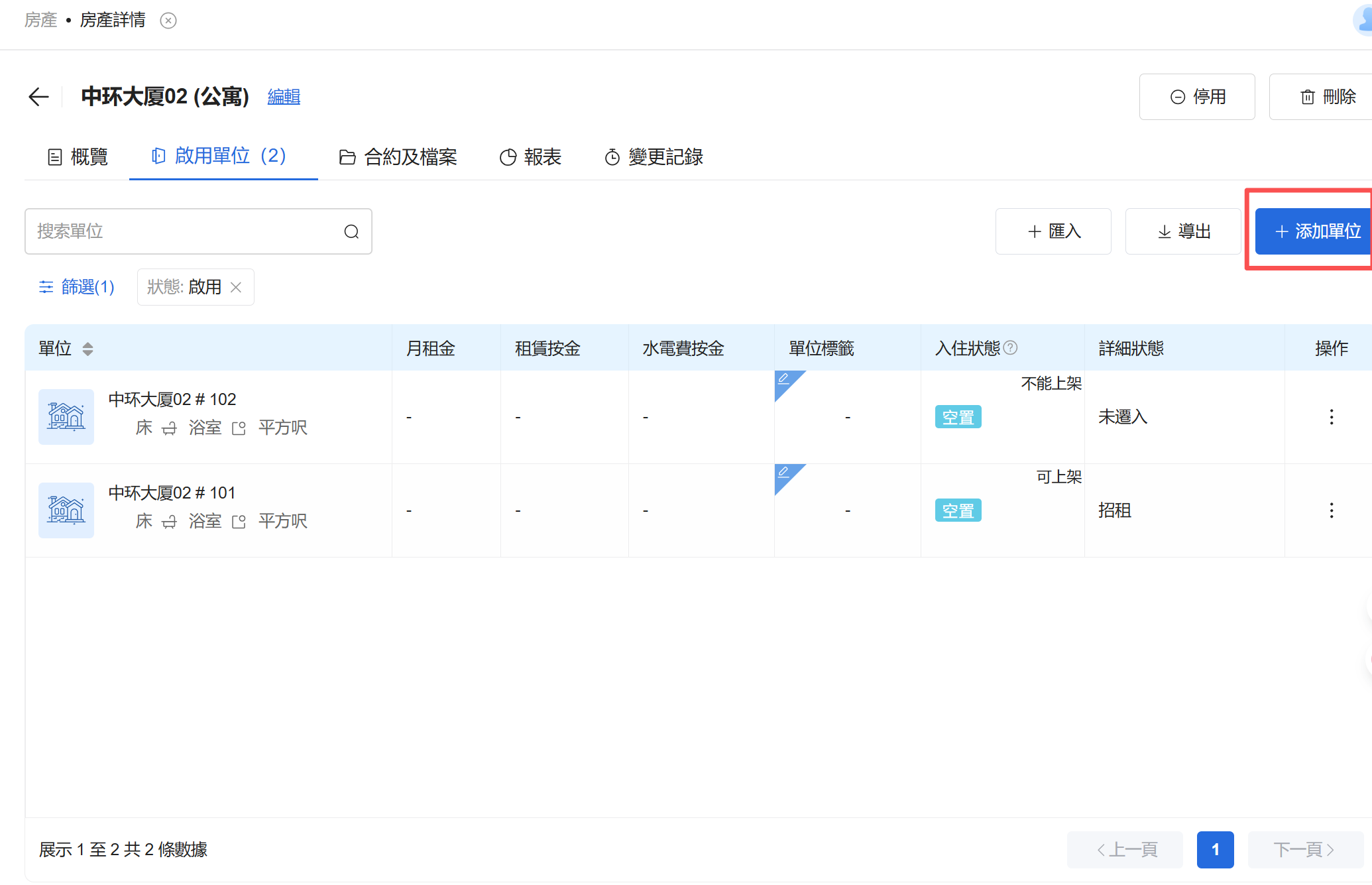 依次點擊【房源管理】——【房源】——【進入房產詳情】——【啓用那元】——【添加單位】。