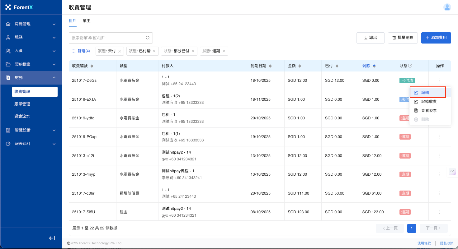 步驟一: 請從左側菜單導航至 【財務】—【收費管理】,然後選擇 【租戶】分頁。