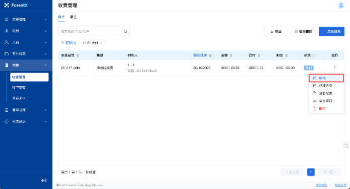 您可按照以下步驟修改一筆未支付的收款賬單內容:步驟一: 請從左側菜單導航至 【財務】—【收費管理】,然後選擇 【租戶】分頁。