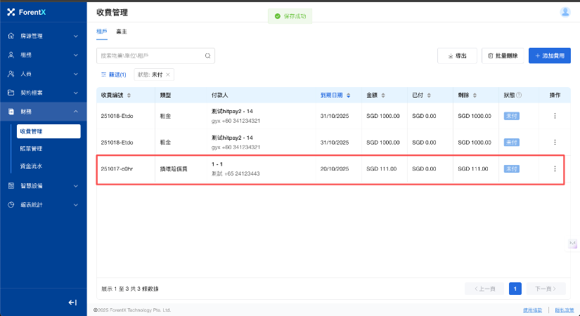 步驟一:步驟二: 請從左側菜單導航至 【財務】—【收費管理】,然後選擇 【租戶】分頁。