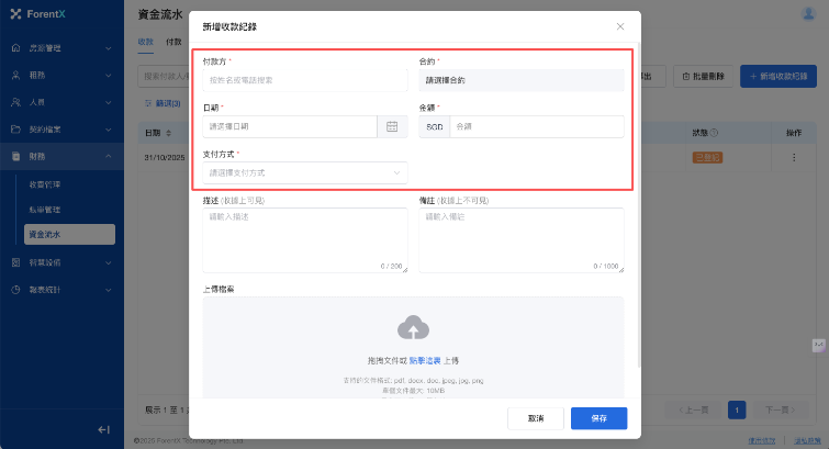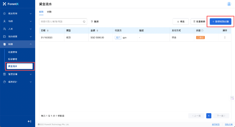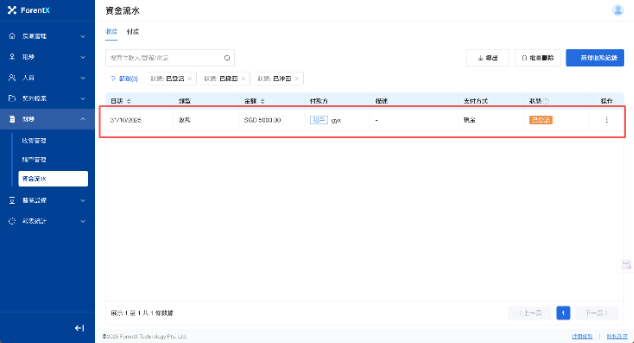 步驟三: 點擊 【保存】,您所新增的收款流水將會即時顯示於 【資金流水】 頁面中。