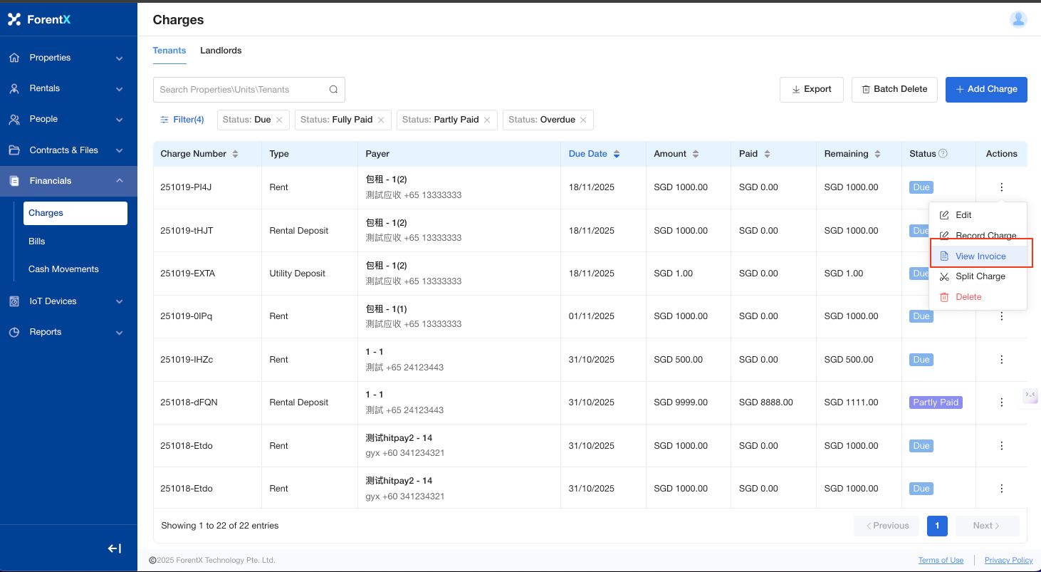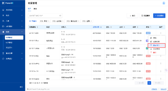 請從左側菜單導航至 【財務】—【收費管理】,然後選擇 【租戶】/【業主】分頁 進行查看。