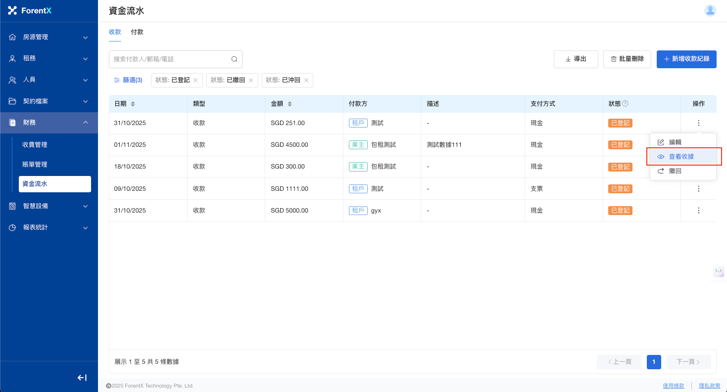 步驟一: 請從左側菜單導航至 【財務】—【資金流水】,然後選擇 【收款】分頁。