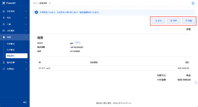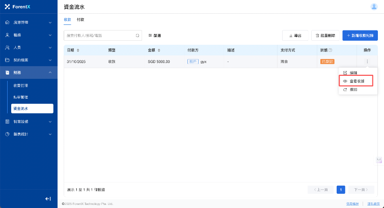 您可以按照以下步驟查看並下載已記錄的收款記錄收據:步驟一: 請從左側菜單導航至 【財務】—【資金流水】,然後選擇 【收款】分頁。