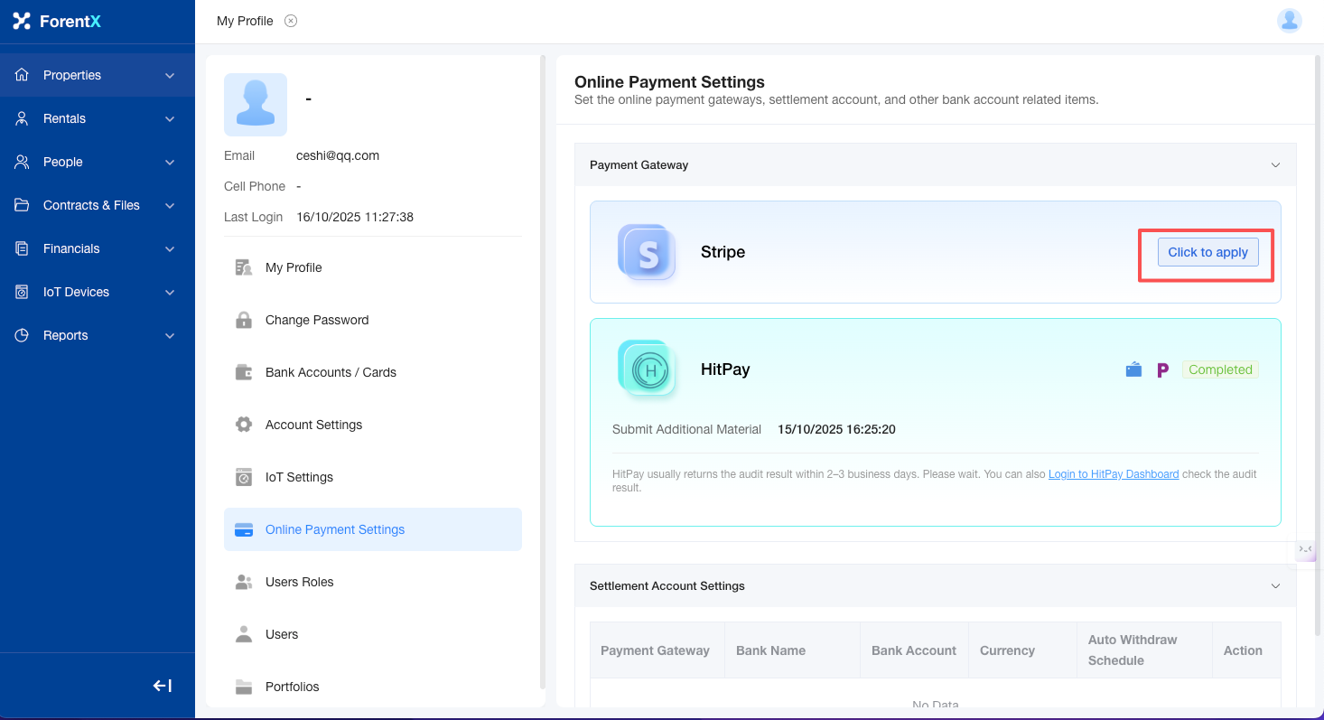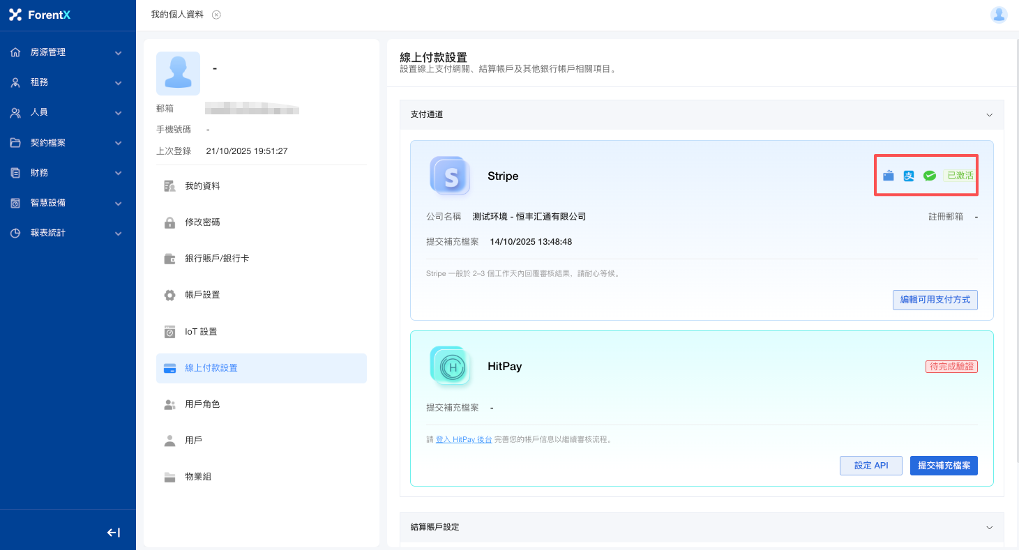 | 3. Final Activation | ForentX Platform | Merchant is redirected back to the platform, and the Stripe status is automatically updated. | Stripe Channel Status: Completed |