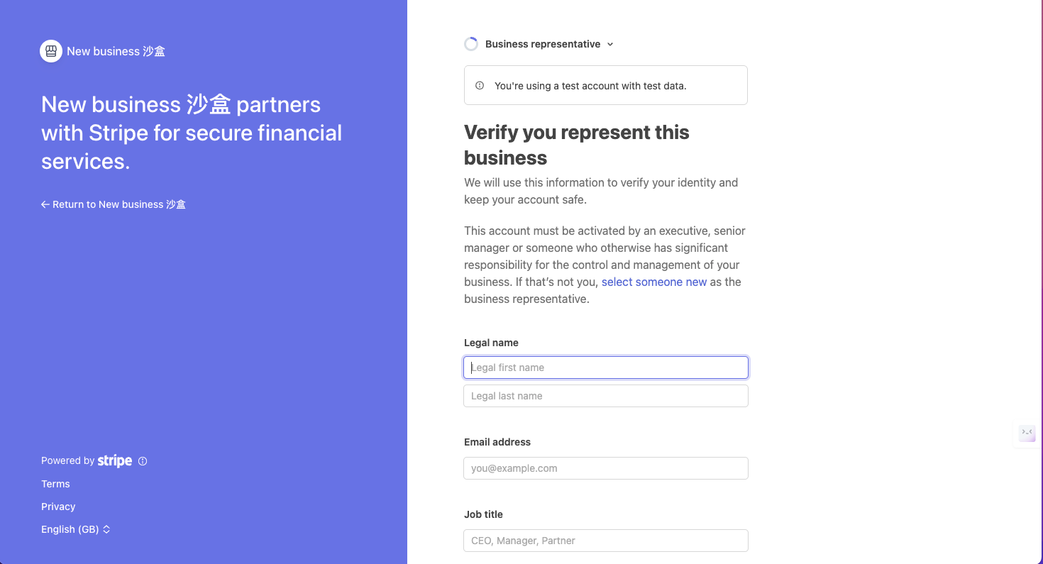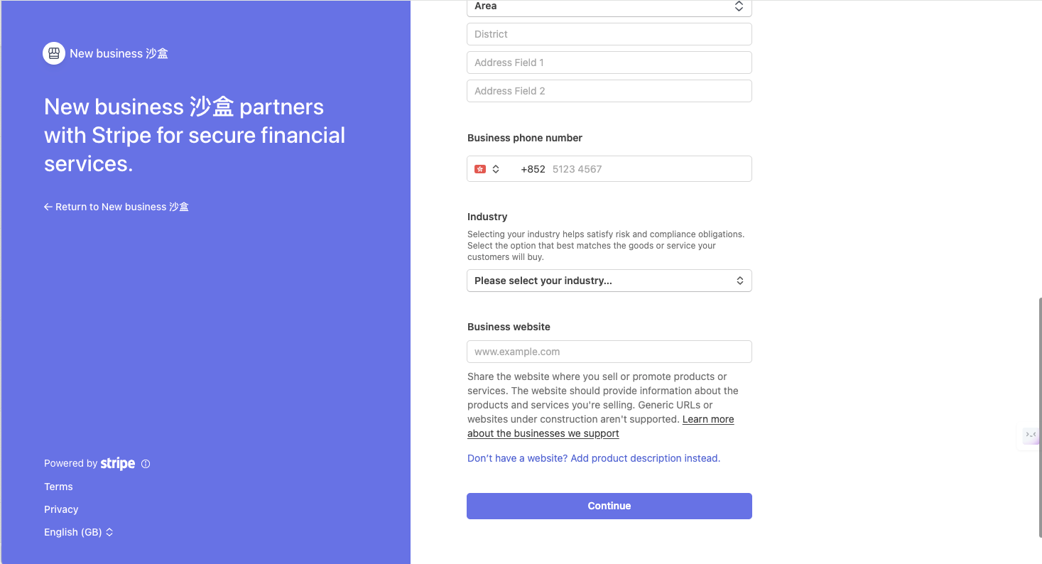 - A pop-up window will appear where you fill in basic information, selecting the Country/Region, Business Type, Business Name, Statement Descriptor, and desired Payment Capabilities.