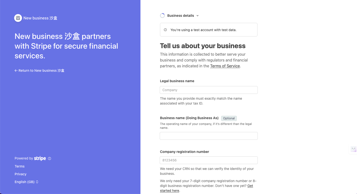 | Company Details | Legal business name, business name (optional), company registration number, business address, company phone number, industry, company website |