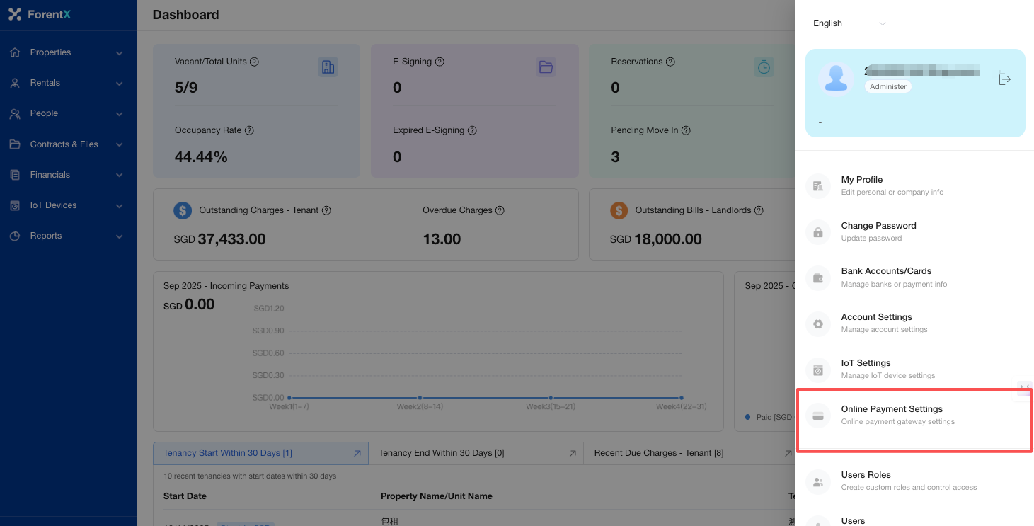 - Log in to the Landlord Backend and navigate to "Online Payment Settings" in the right-hand menu bar.