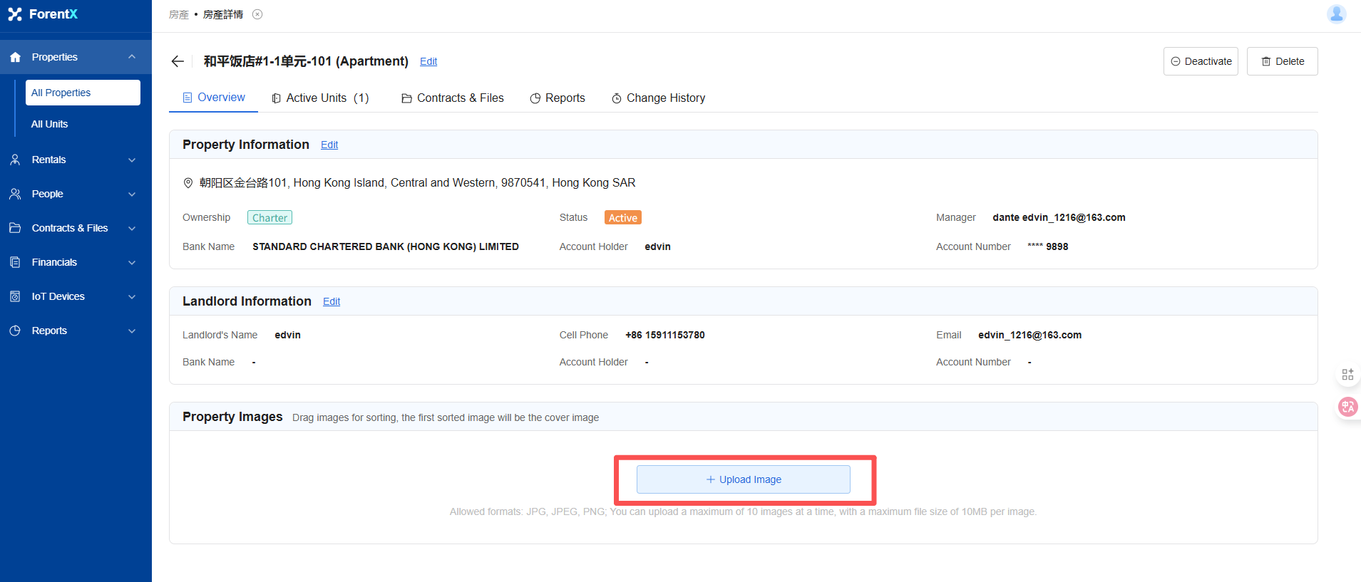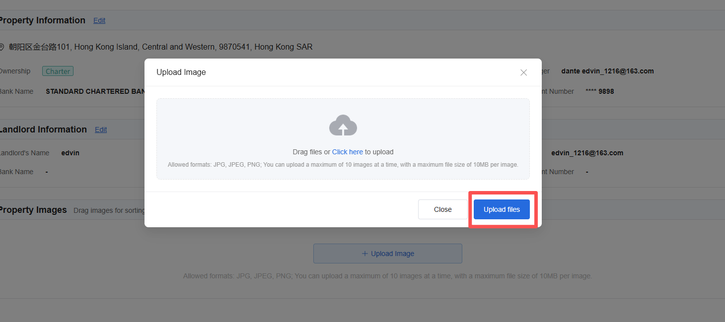 In the All Properties list, select the apartment you want to manage, click anywhere in the list to enter [Property Information], click [Upload Image], and drag the image you want to upload.