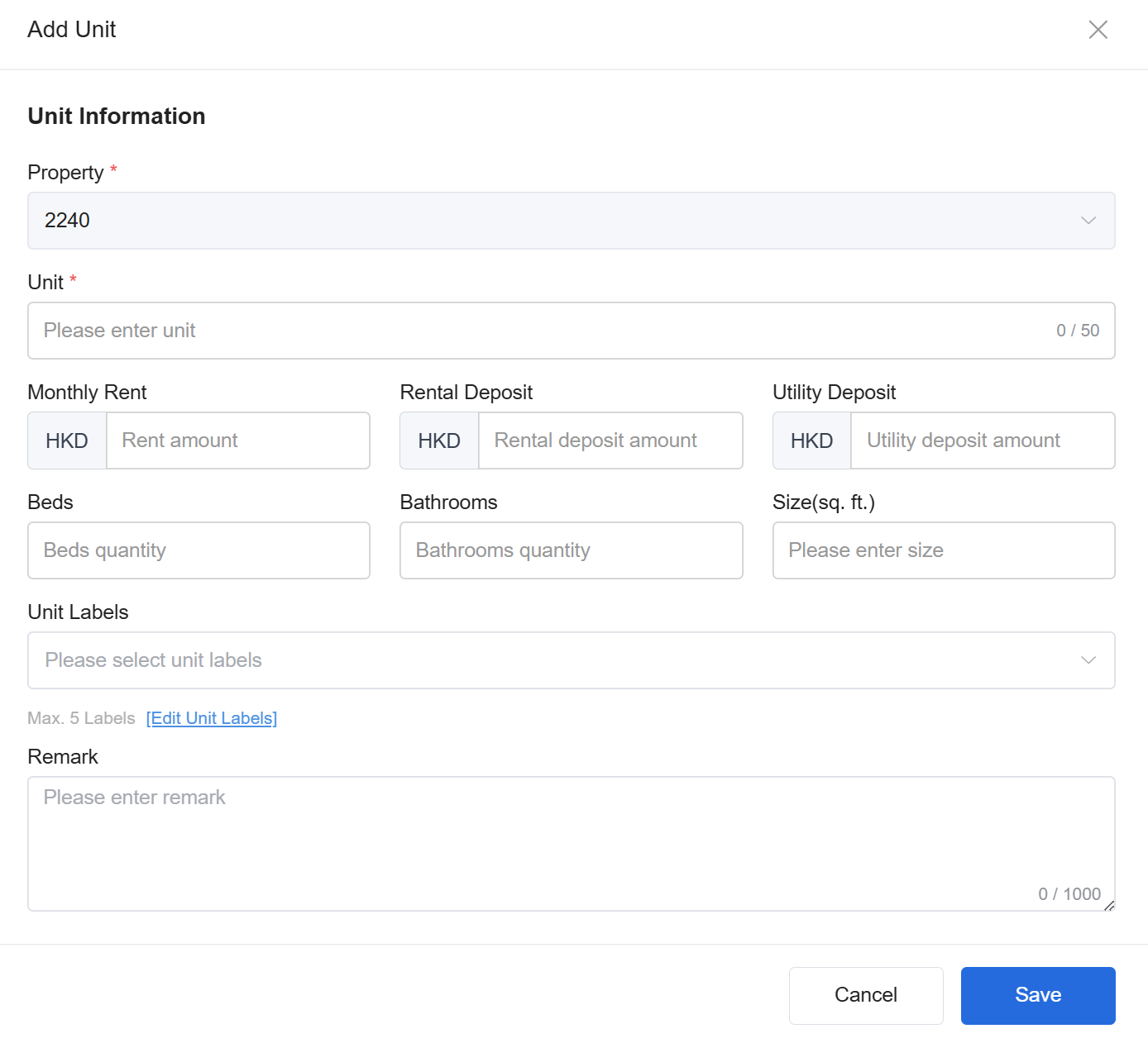 Click the following sequence: [Properties] → [All Properties] → [Property Information] → [Active Units] → [Add Unit].