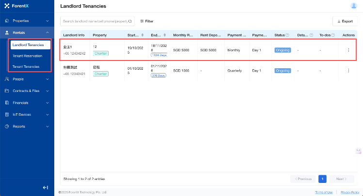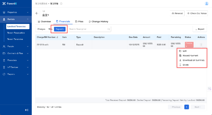 You can view and manage all tenancy Deposits you hold via the Lease Details Page of [Owner Tenancy Management] / [Tenant Reservation] / [Tenant Tenancy Management]. This section aggregates statistics for all collected, refunded, or offset deposit information. The following uses [Owner Tenancy Management] as an example.