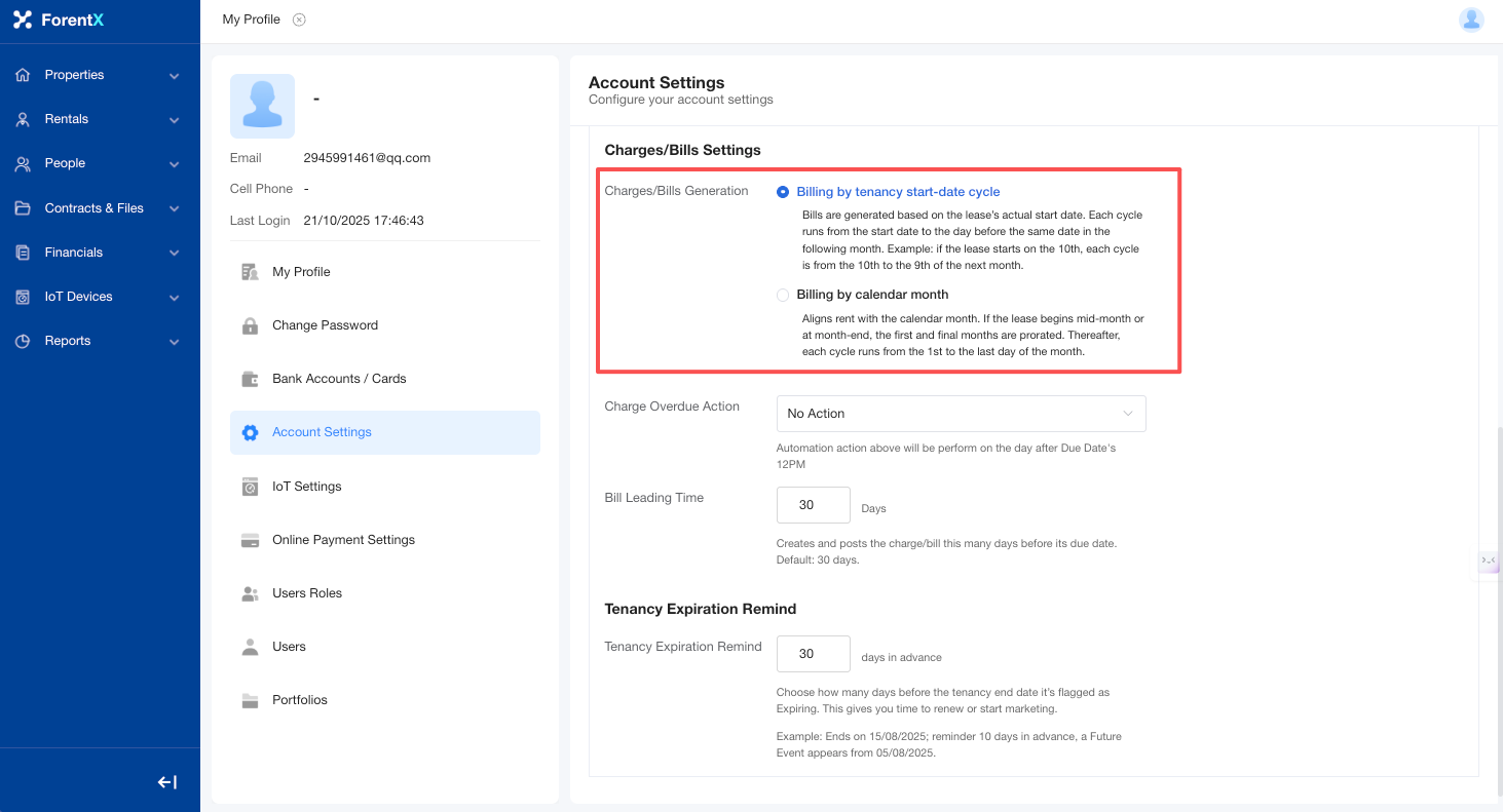 Step 2: Proceed to the Charges/Bills Settings. You may choose between [Billing by tenancy start-date cycle] or [Billing by calendar month] based on your requirements.