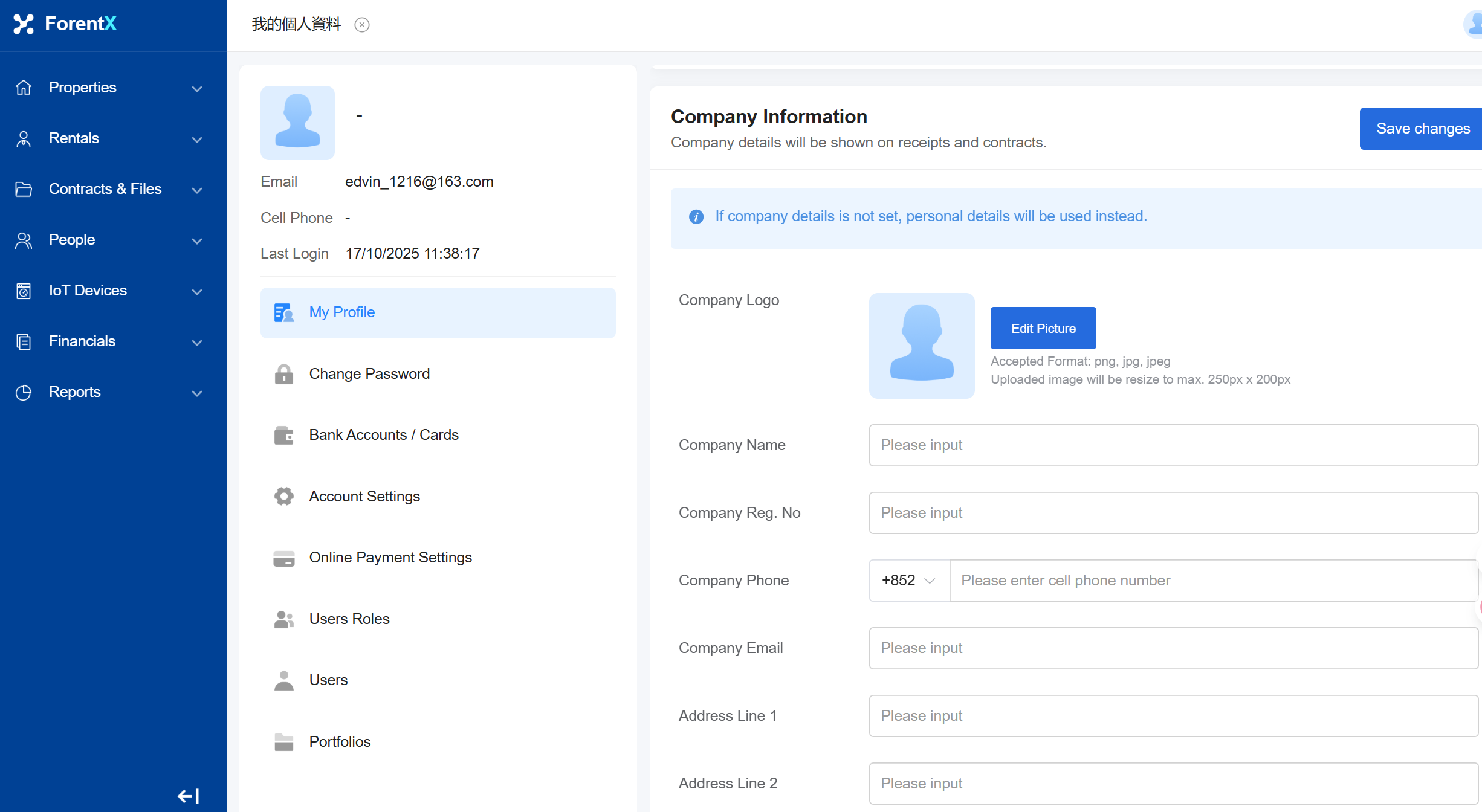 In the personal center at the top right corner, on the Company Information page under My Profile, you can upload your company logo and fill in details like the company name, registration number, and contact address. This information will be used for invoices and contracts.