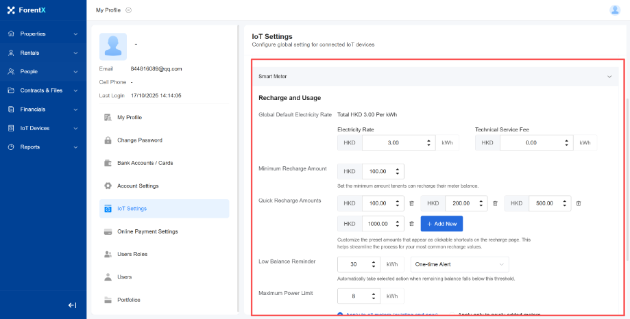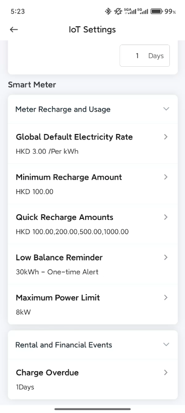 Step2:Click [IoT Settings] to enter the configuration page and set configure global default electricity price, minimum recharge amount, power reminder threshold, and maximum power, etc;