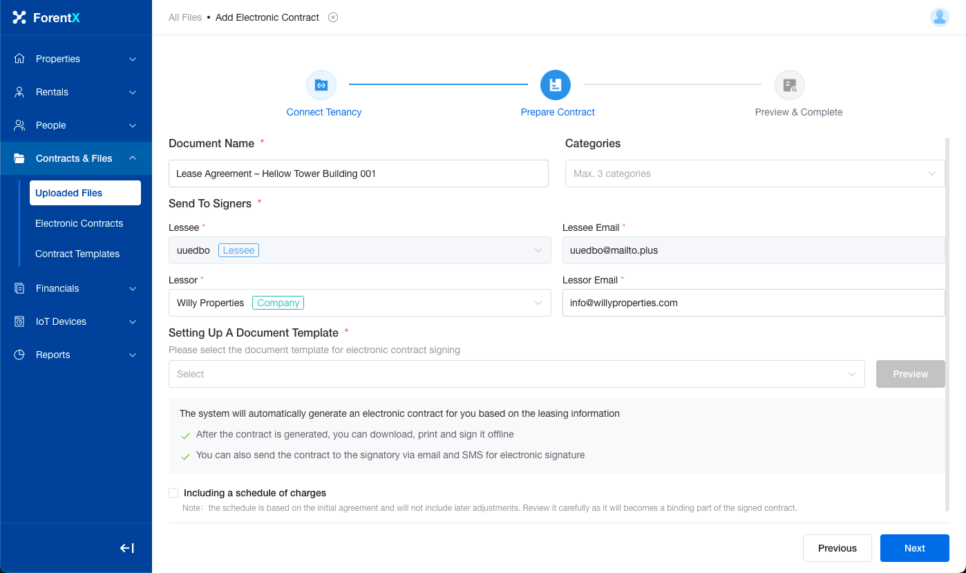 - The system will generate a preview of the electronic contract by populating the selected template with the tenancy's information.