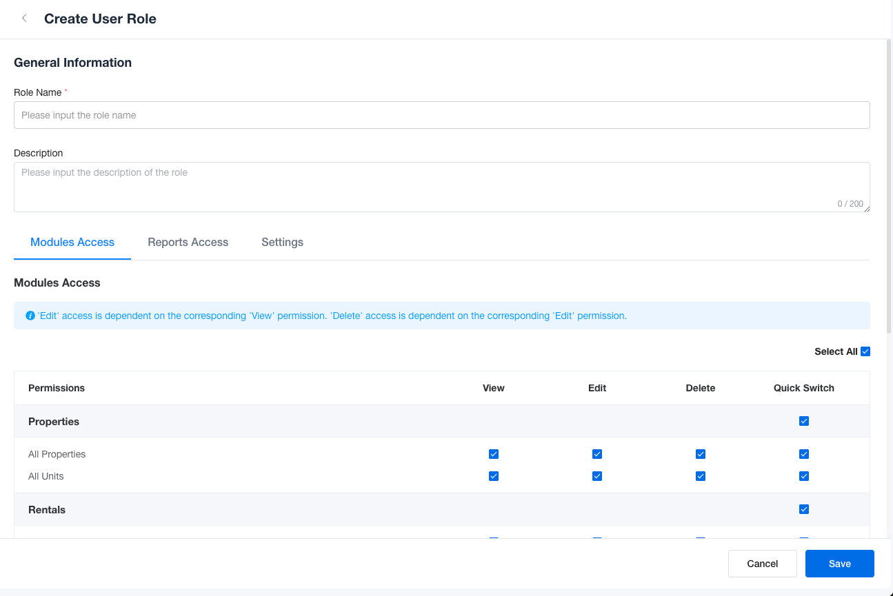 After defining the role's name and description, you will configure its specific permissions across three main areas: Modules Access, Reports Access, and Settings.