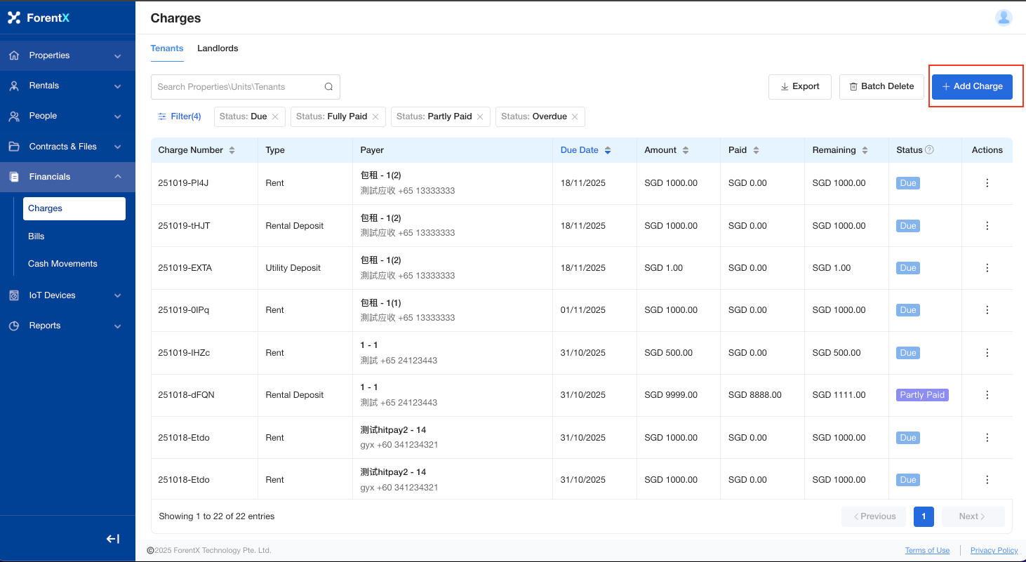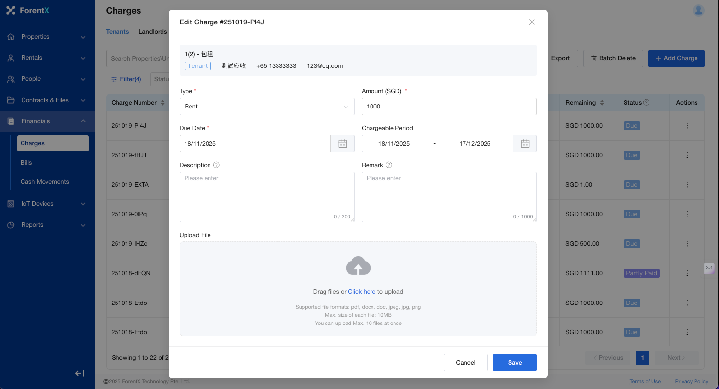 Navigate from the left-hand menu to [Financials] — [Charges], and select the [Tenant] TAB.