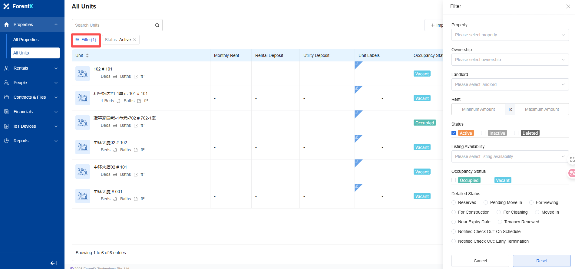In [Properties] — [All Units], you can manage your units using multiple filters.
