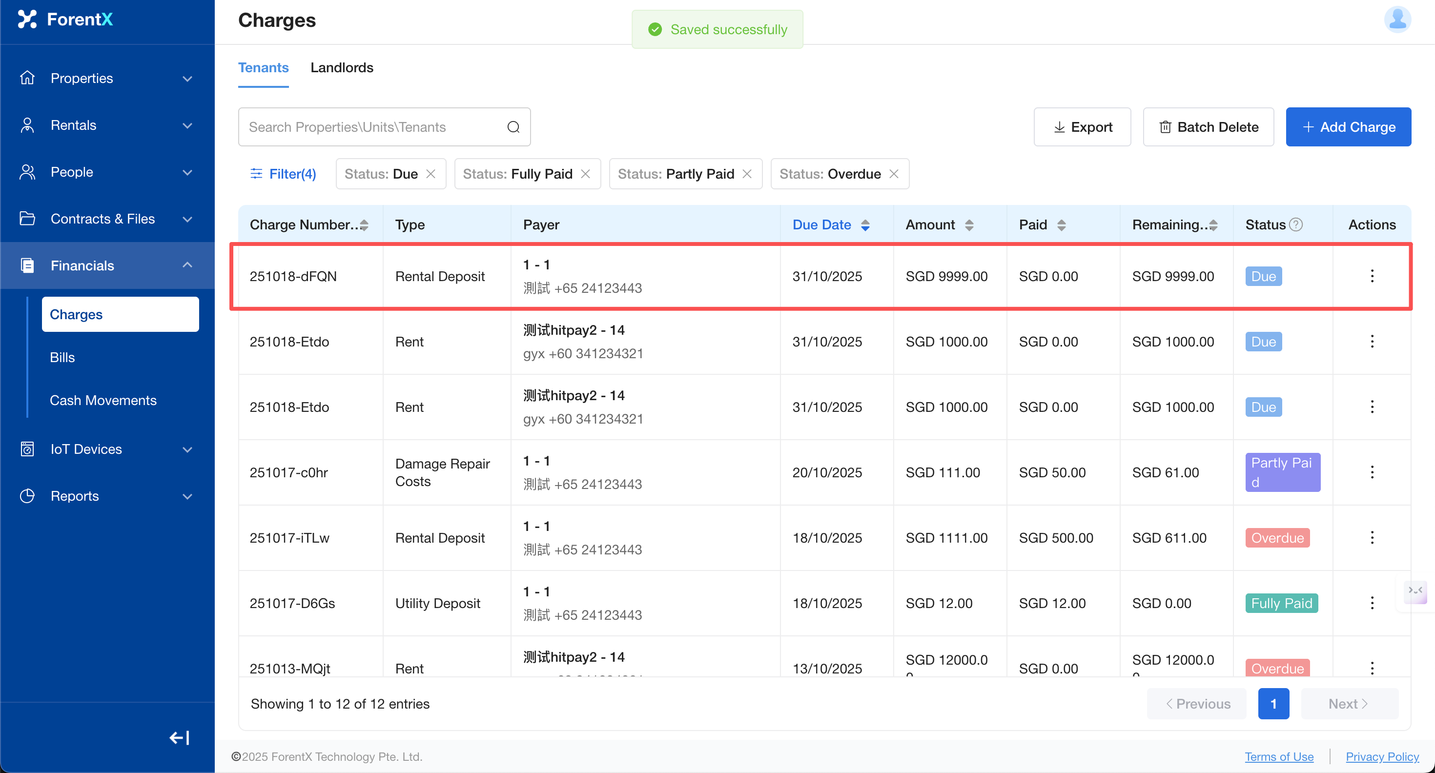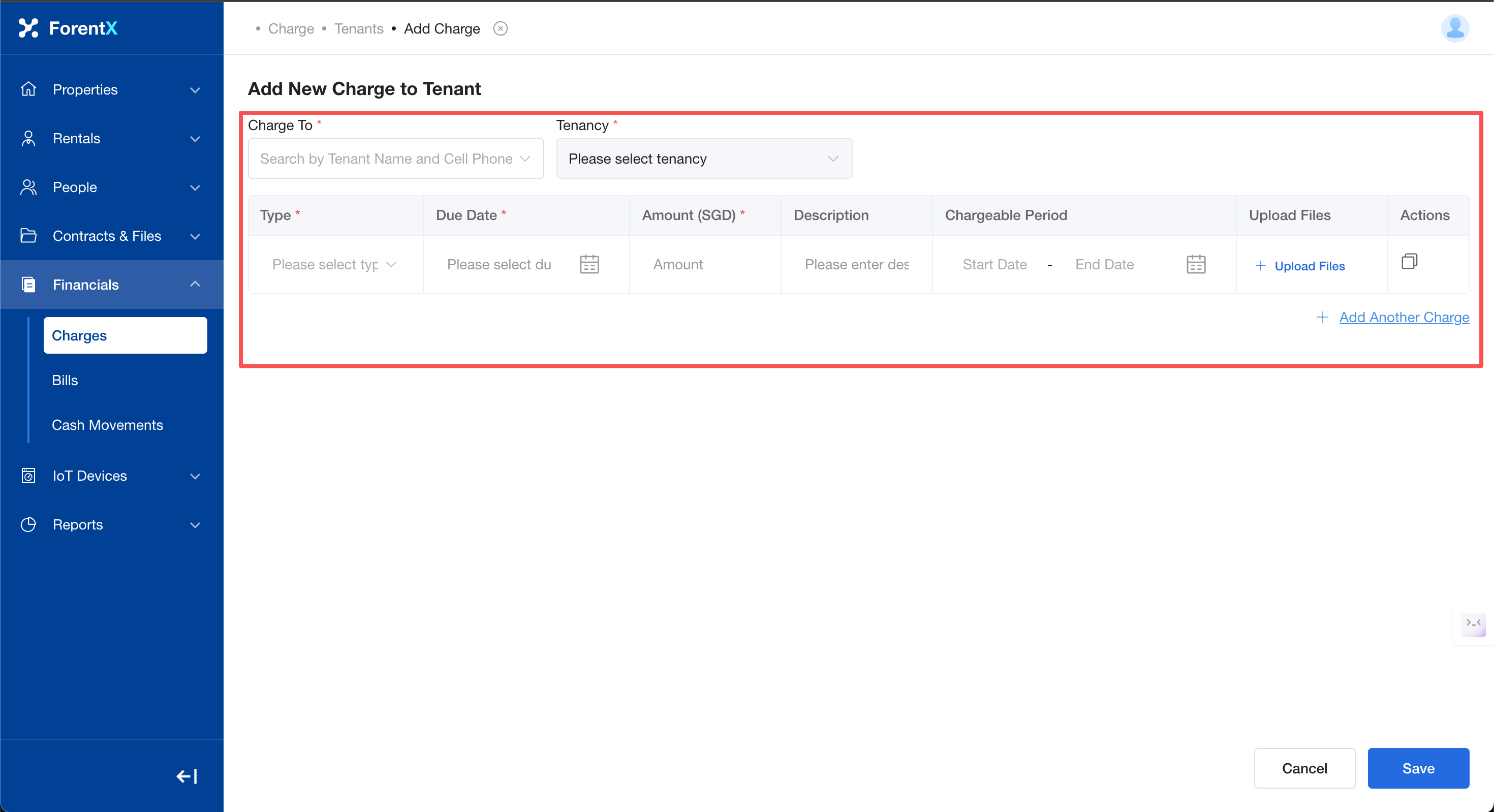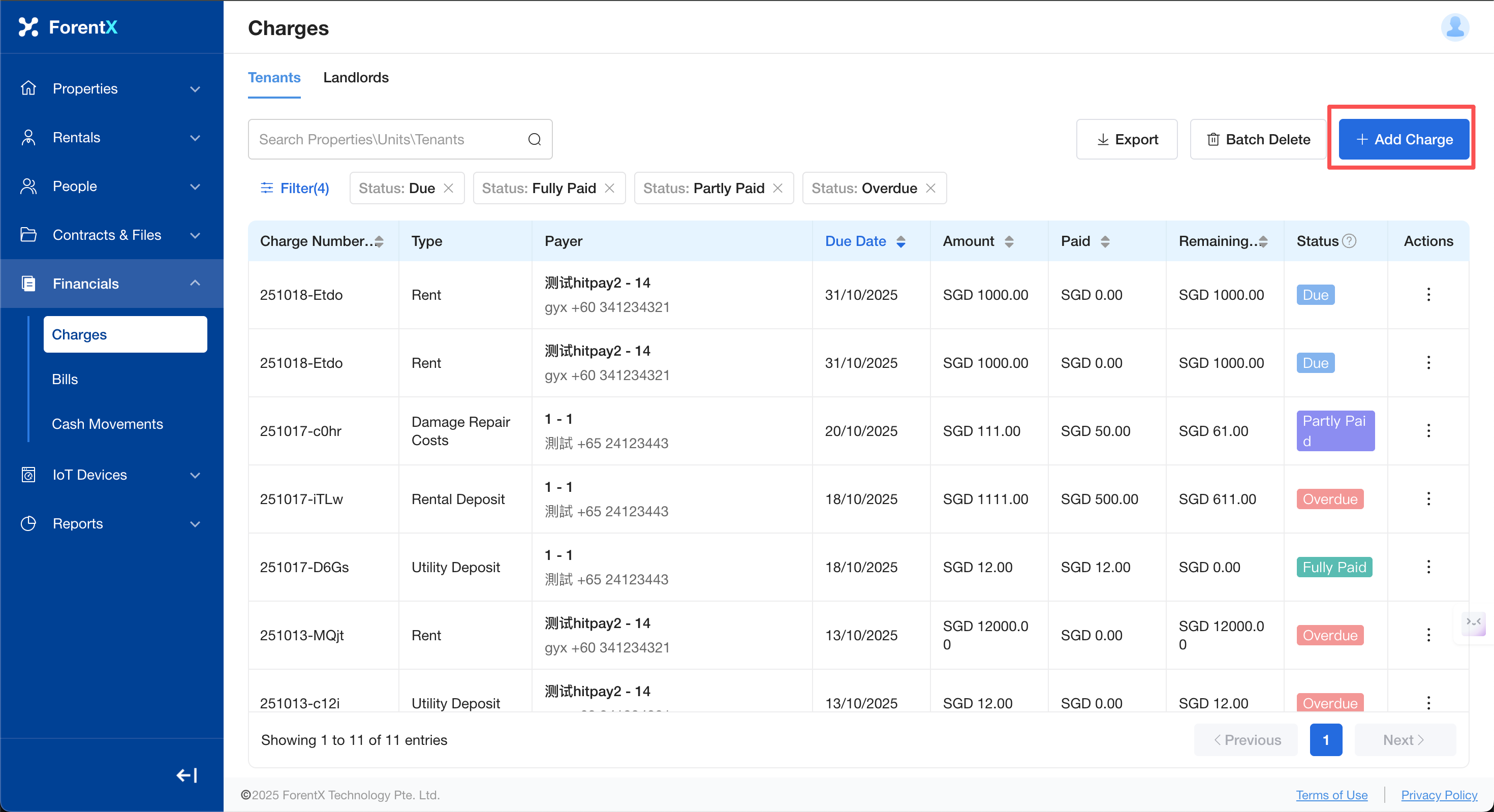 Navigate from the left-hand menu to [Financials] — [Charges]. After selecting the corresponding role (Tenant/Owner) at the top, click the [Add Charge] button on the right.