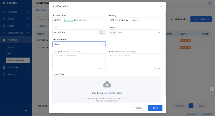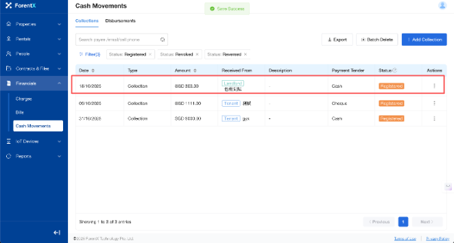 Step 3: Click [Save]. Your newly generated collection record will then be immediately visible in the [Cash Movements] module.