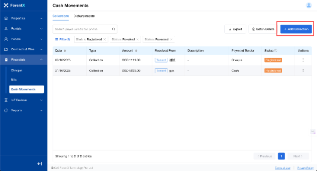 Step 1: Navigate from the left-hand menu to [Financials] — [Cash Movements], select the [Collection] TAB, and click [Add Collection].