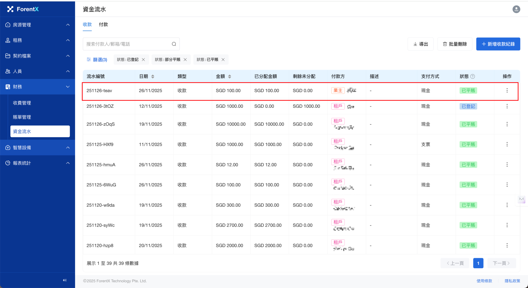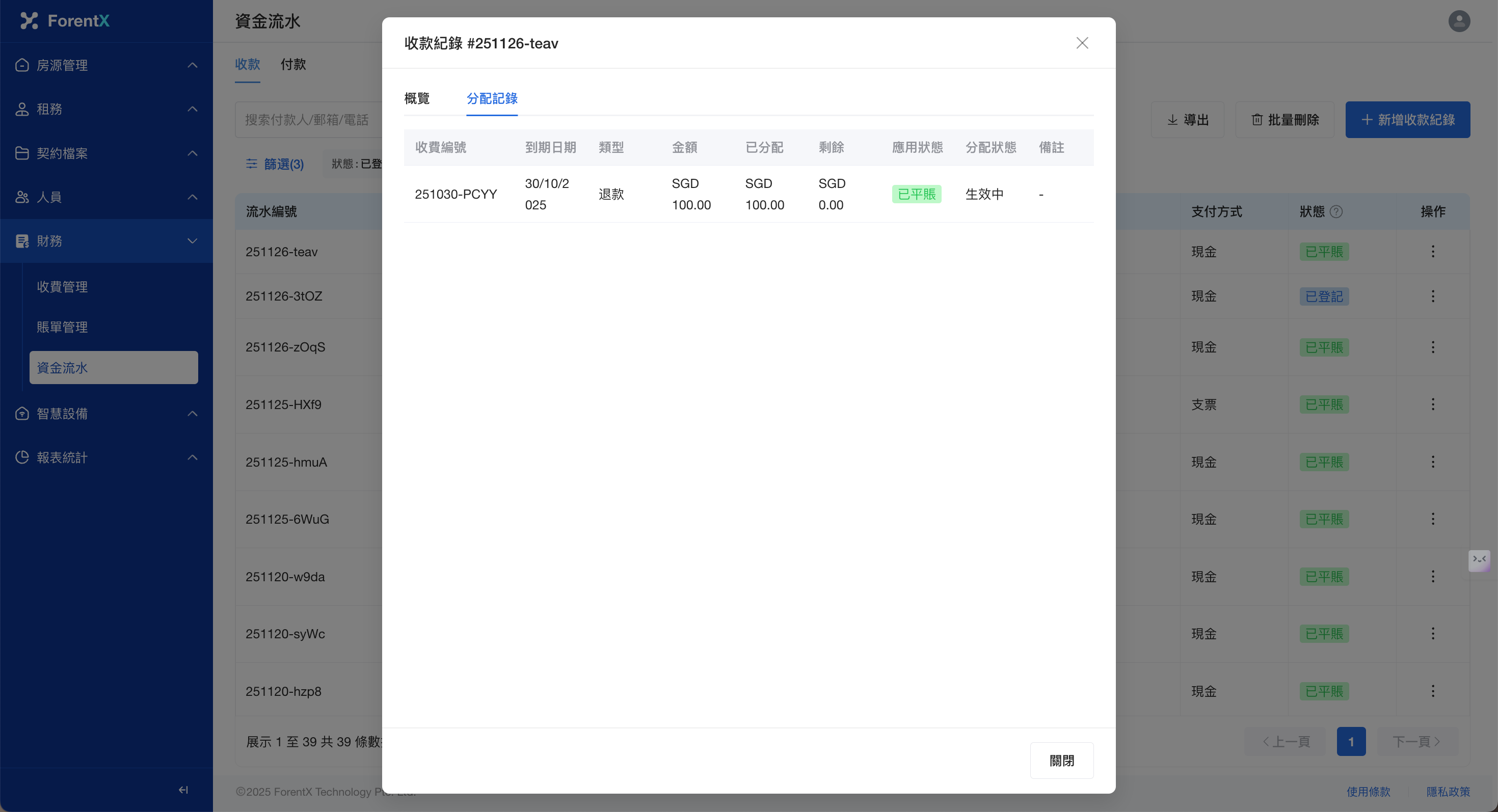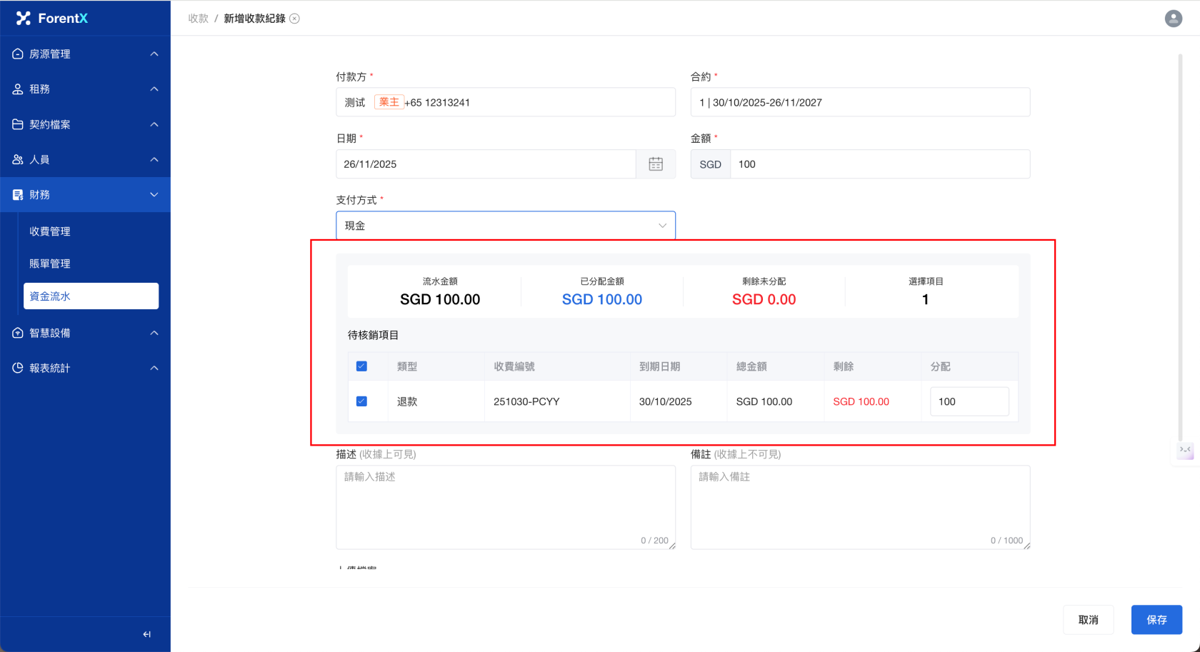 Click [Save] to complete the association between the cash movement and multiple bills. You can view the corresponding status and amount updates in the Cash Movements menu and the Charges/Bill Management area.