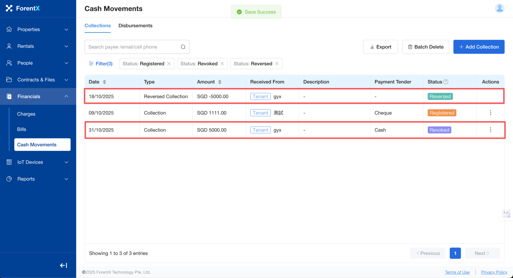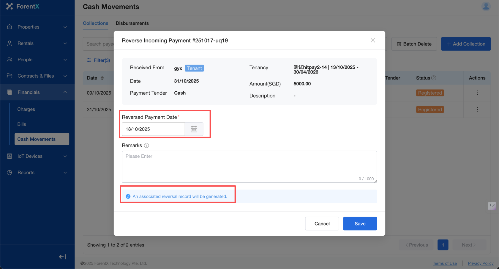 Step 3: Modify the [Reversed Payment Date] and [Remark] as required, and click [Save]. The system will generate a withdrawn record for you with the status [Reversed]. The status of the original record that was withdrawn will be changed to [Revoked].
