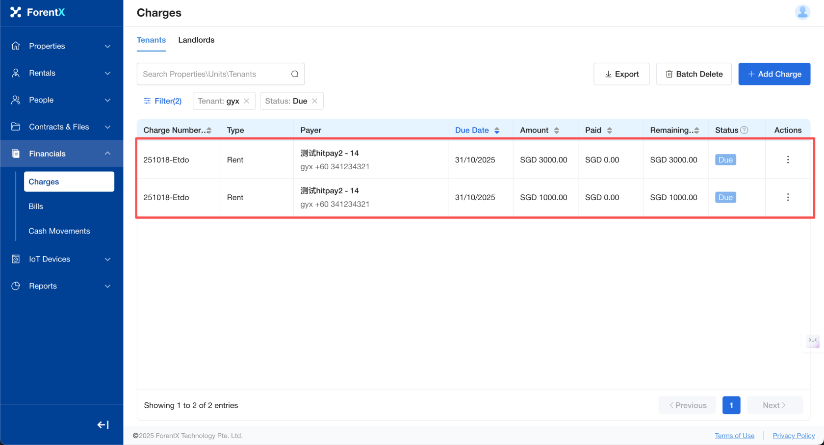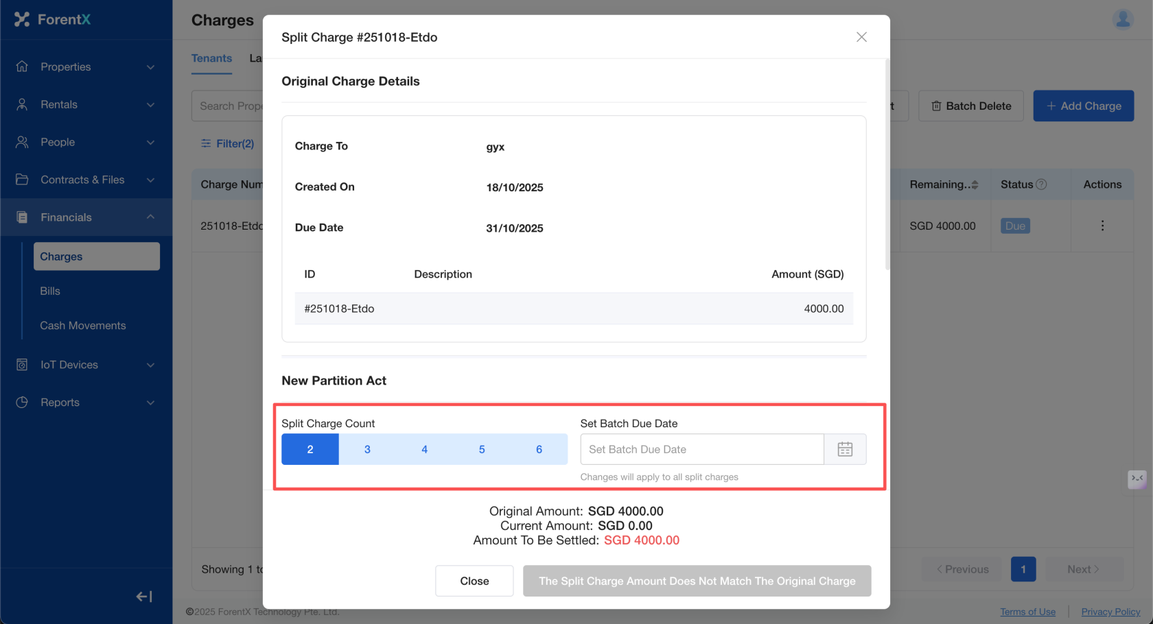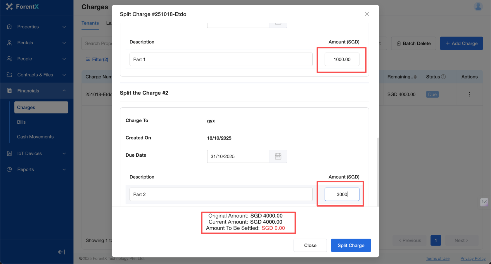 - The total amount adds up to 4000. Once the split charge amount matches the original charge, click [Split Charge], and the system will update the data.