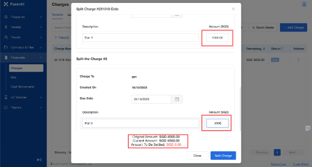 sumtotalofamount adds up to 4000. Once the splitamountschargeis 4000, whichamount matches the originalcharge.charge,Clickclick [Split]Split Charge], and the system will update therecord.data.
