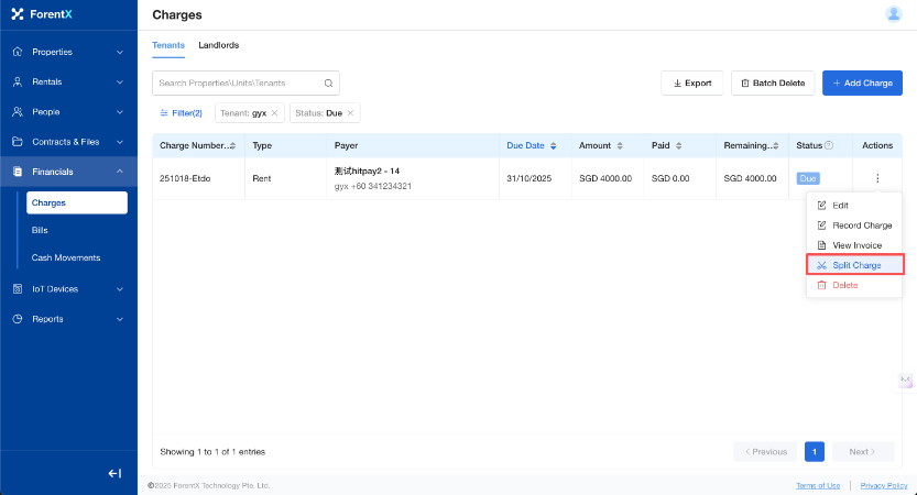 Step 2: Locate the corresponding bill, click [Actions] — [Split Charge].