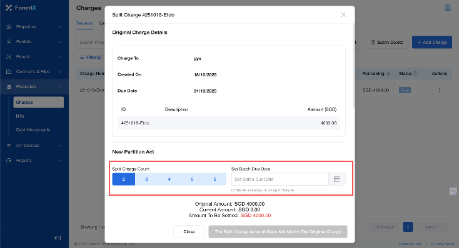 • Step 3: You may select the desired number of charges to split and set a batch due date (this setting will apply to all split charges). The system will automatically reconcile the amounts after your inputs. Click [Split] to update the record.